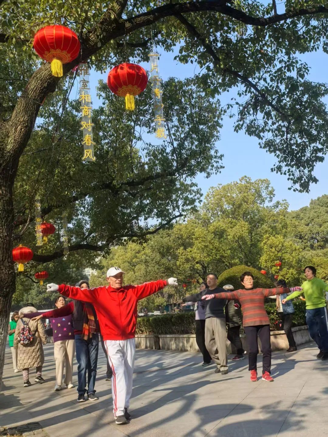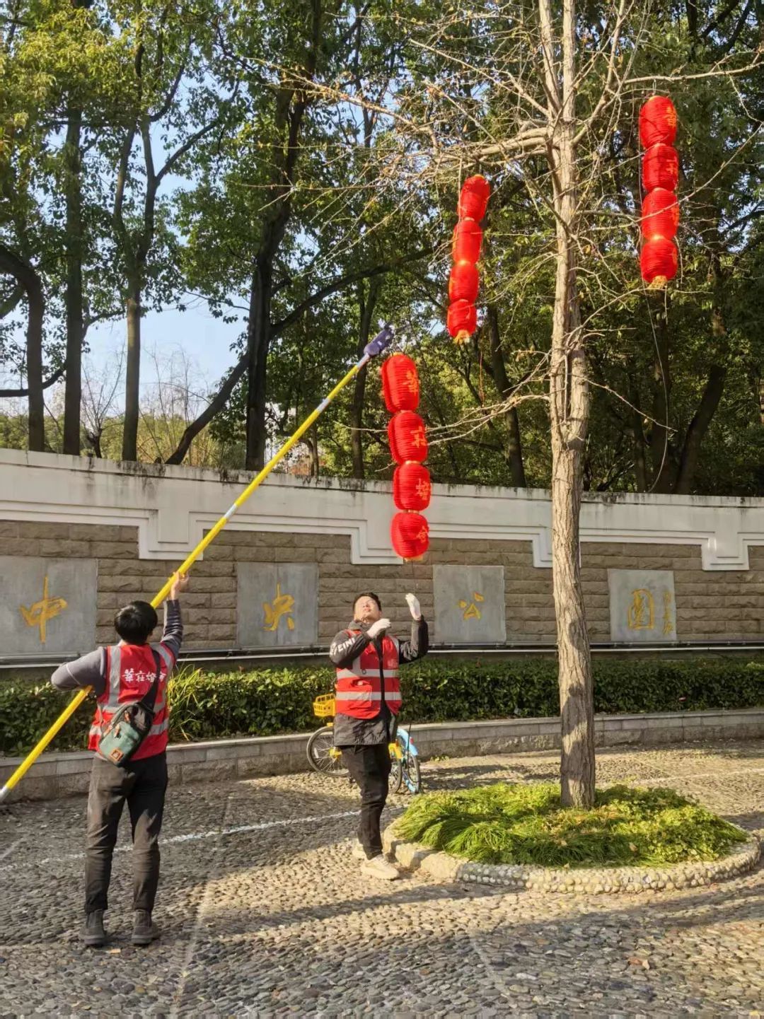 莘庄中央公园,工作人员正在布置新年灯会。公园里晨练的人们也换上了喜气洋洋的新衣。