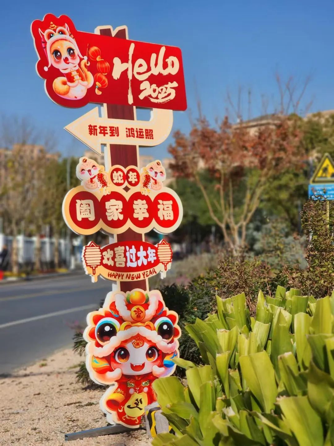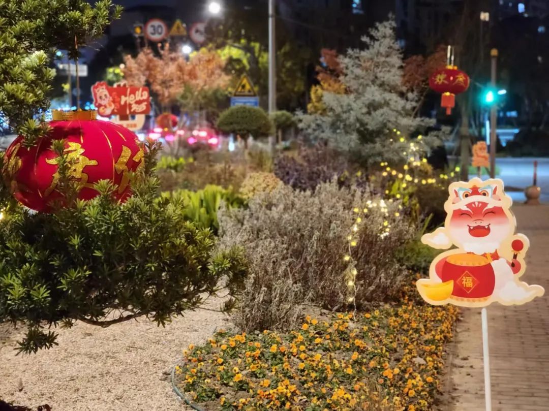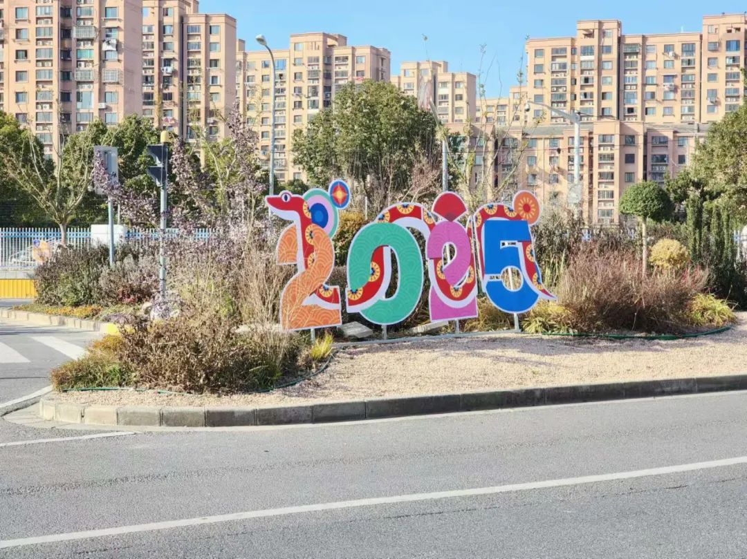 蛟龙去,灵蛇来,灵蛇献瑞乐开怀。江航南路浦航路三角绿地以大红灯笼、蛇年插排等装饰为主要设计,组成了最强“氛围组”!