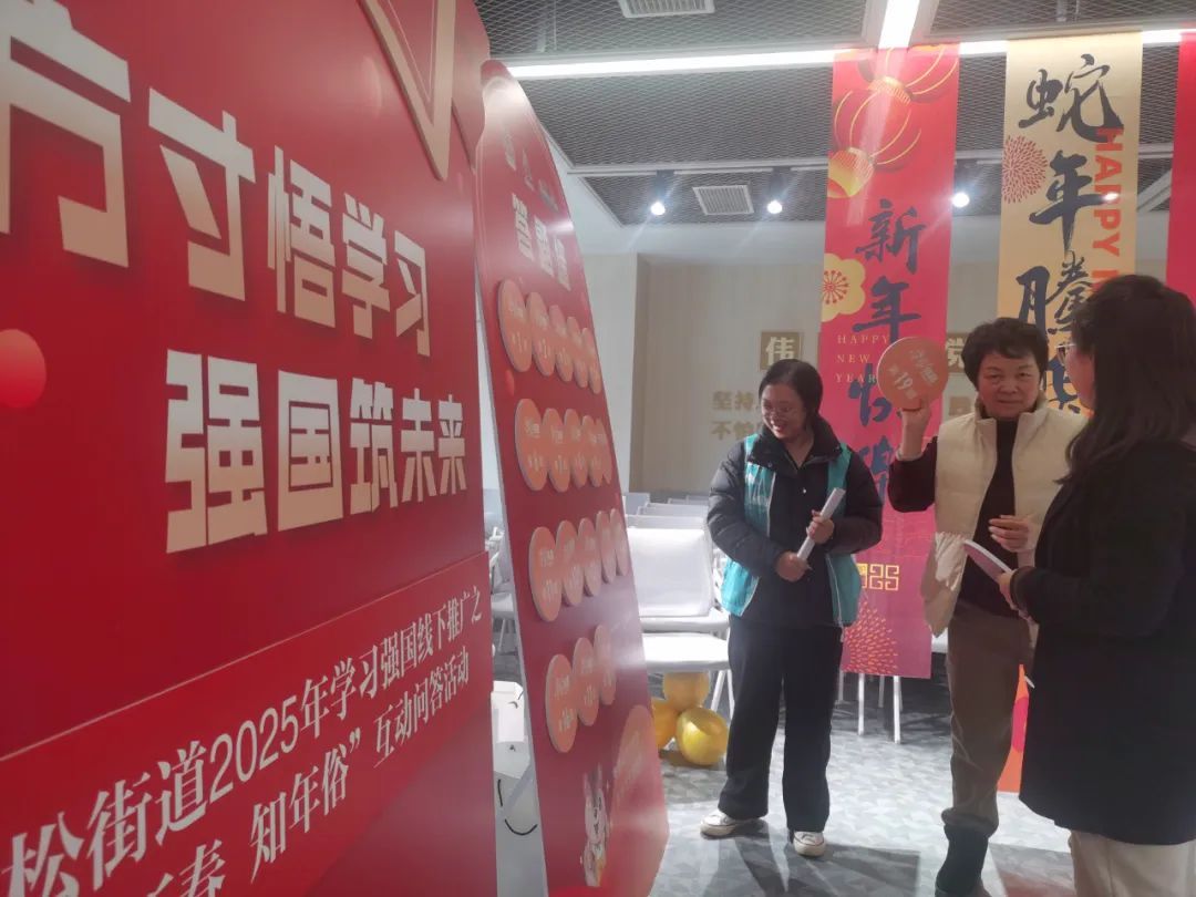 此外,活动现场还特别设置了方松街道学习强国线下推广之“悦新春 知年俗”互动问答环节,增添了学习的新“年味”。同时,志愿者向居民和学生们介绍了“学习强国”学习平台的多样化功能,让“学习强国”学习平台成为辖区居民充电学习的“指尖加油站”。