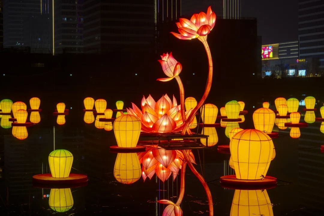 由于今年灯会搬到了刚落成不久的美兰西湖公园,公园内的水域也被利用了起来,作为每年夏季龙船节必不可少的角色,莲花灯首次出现在罗店暖春灯会上。放大版的莲花灯,寄托着“明灯三千,所愿皆成”的美好祈愿。
