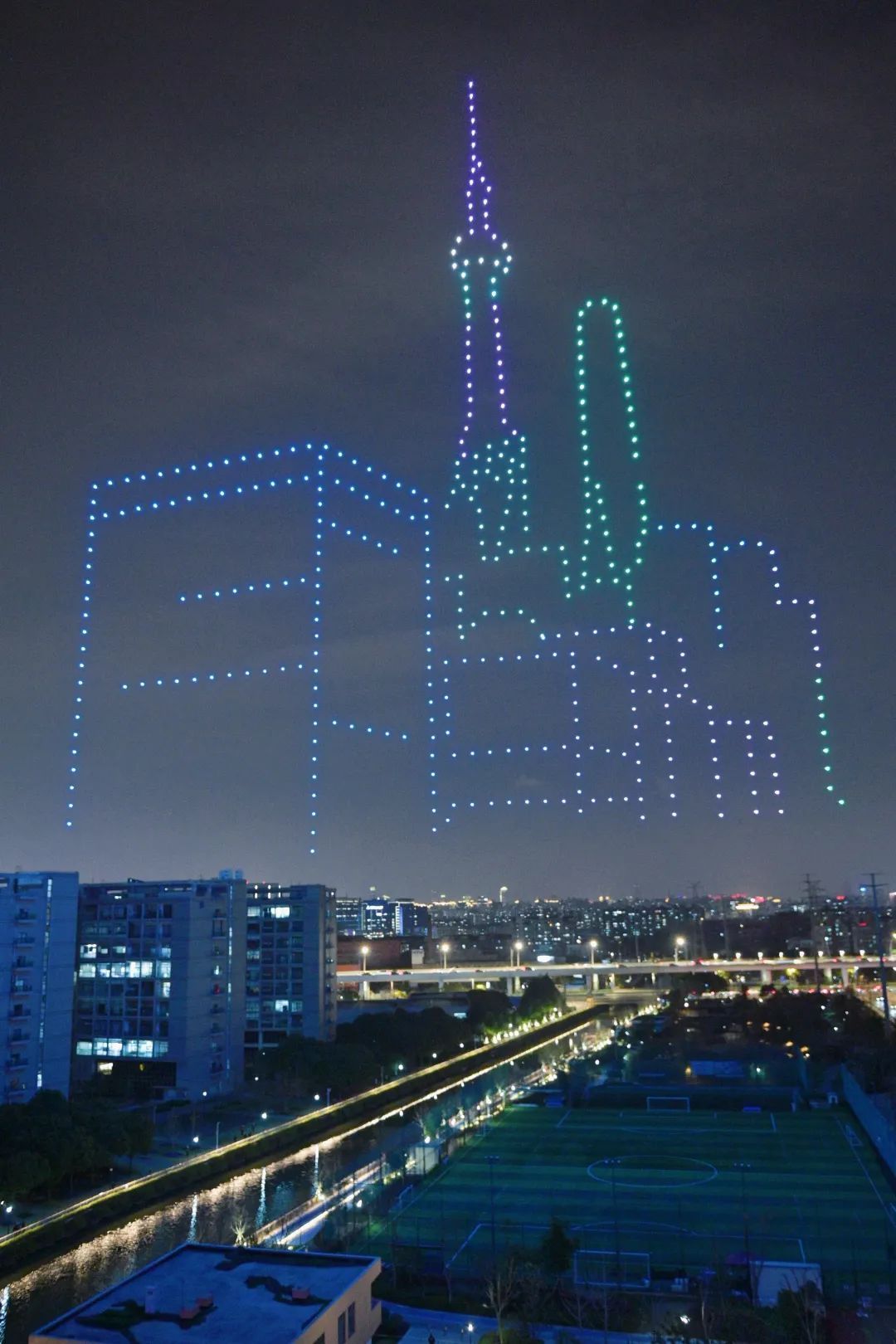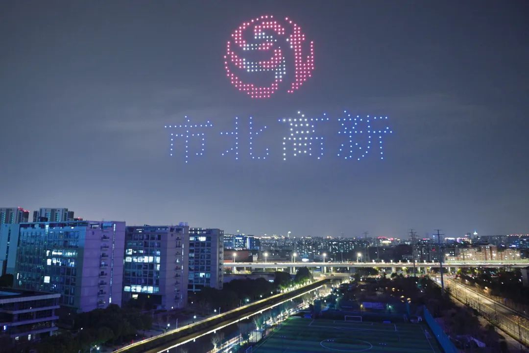 随着无人机的升空,以天空为幕,城市为背景,光影为画笔,一幅幅动态变幻的绚丽画面徐徐展开。市北高新、数据港、数通链谷等LOGO依次在夜空中浮现。