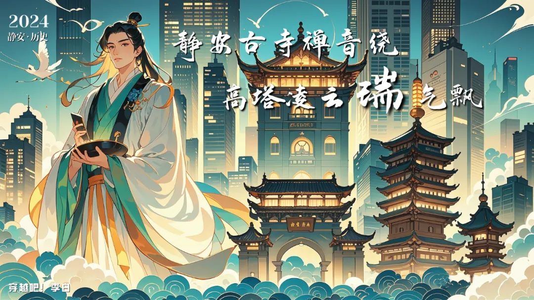 让穿越而来的李白在静安寺留下足迹,探寻禅意,融合仙风道骨与佛系氛围,共筑一场幽静的梦境。题诗:静安古寺禅音绕,高塔凌云瑞气飘。