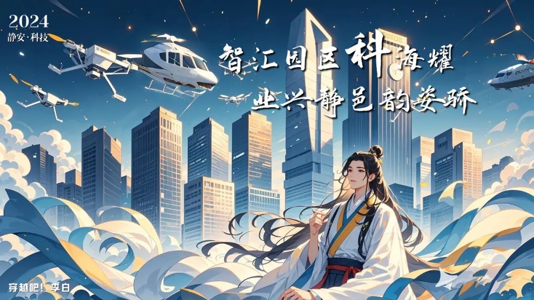 李白穿越到静安区的高新科技园区,将古典诗意与现代科技融合,创作出属于未来的诗篇。题诗:智汇园区科星耀,兴业静邑韵姿骄。