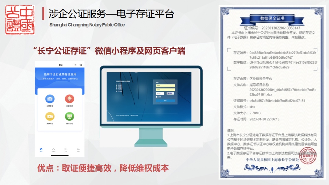 长宁公证处在深入了解企业服务需求后,对现有区块链存证平台全方位升级改造,进行定制化开发,在确保企业数据安全的同时,起到企业商业秘密、知识产权双重保护的效果。