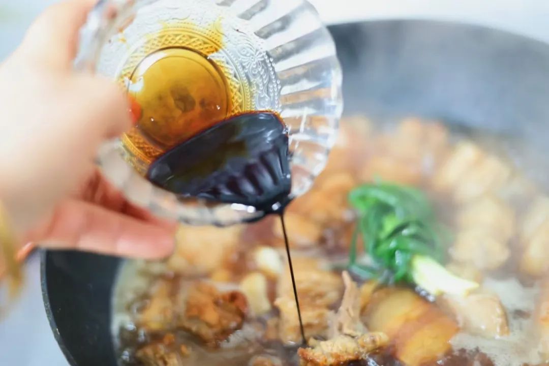 3.加蒜瓣、葱、姜;倒点老抽、生抽,倒入热水没过肉,小火煮半小时。