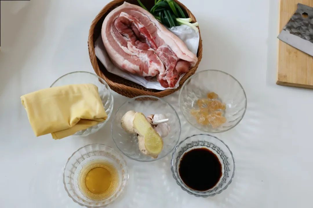 食材:五花肉600克、薄百叶2张、食用油20克、冰糖20克、料酒10克、老抽5克、生抽10克、姜2片、葱数根、蒜5瓣、盐糖适量、蒜叶适量