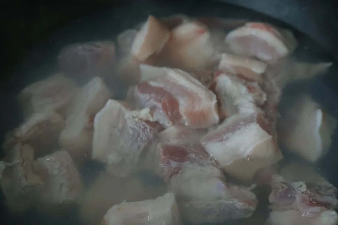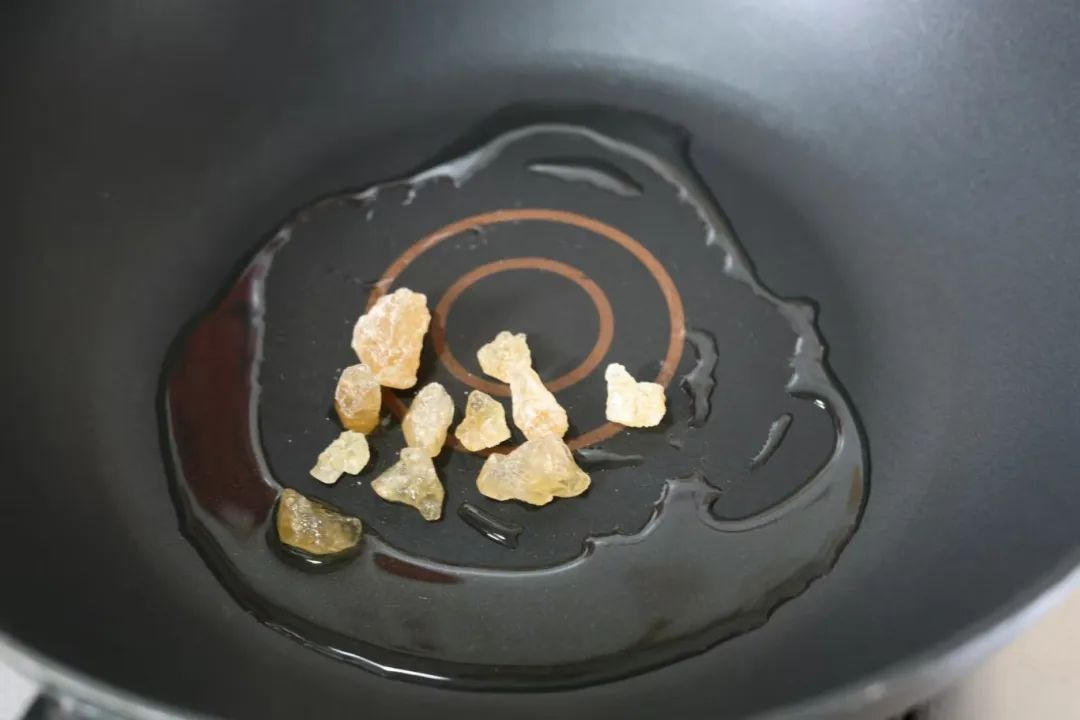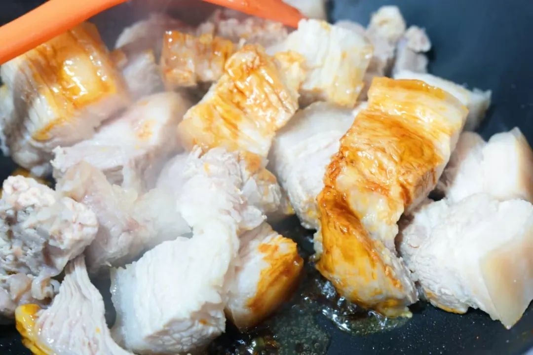 2.锅中放少量油加冰糖炒糖色,倒入焯水后沥干水的五花肉,翻炒均匀。