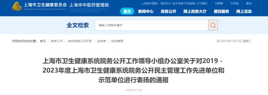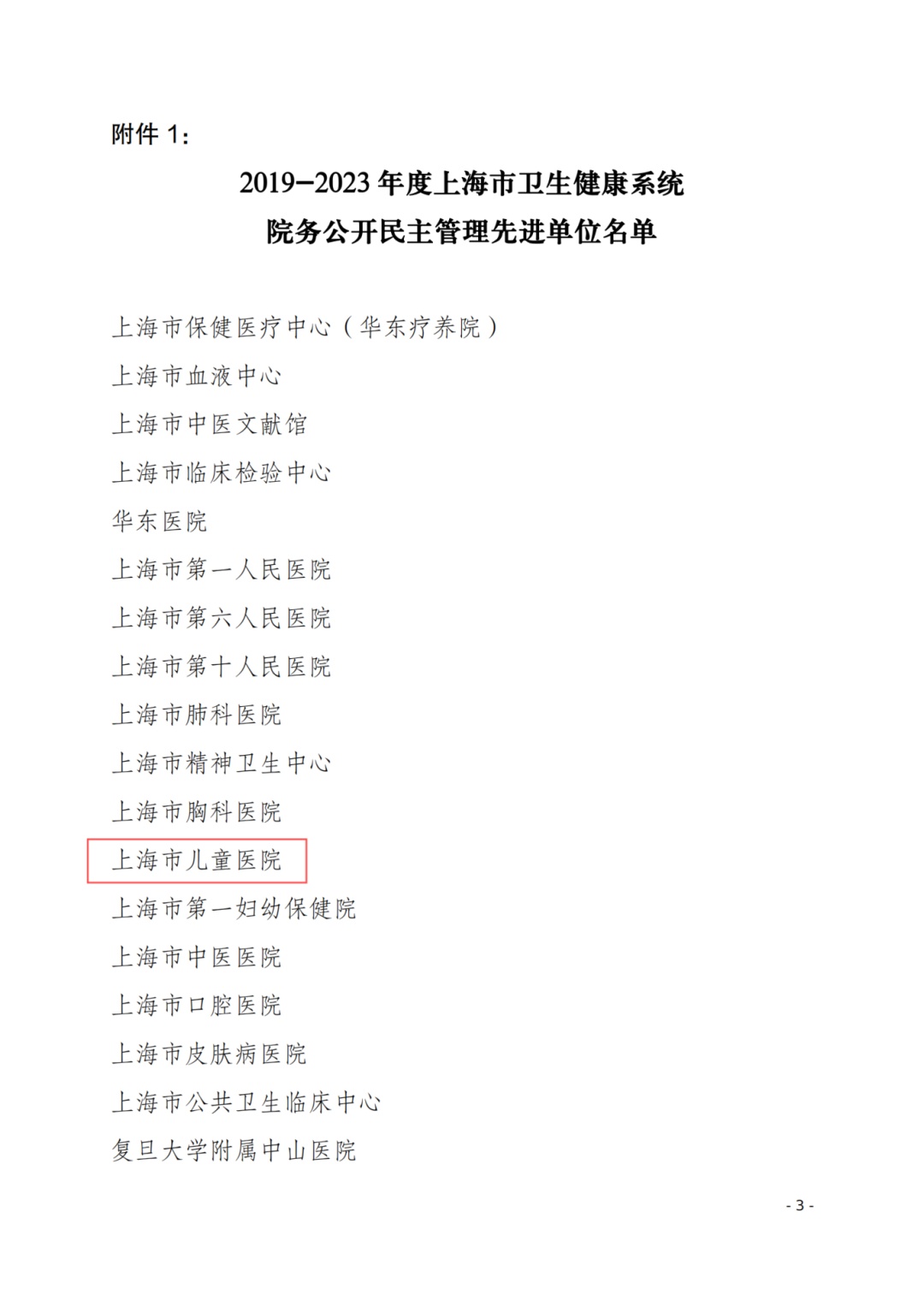近期,上海市卫生健康委发布上海市卫生健康系统院务公开工作领导小组办公室关于对2019-2023年度上海市卫生健康系统院务公开民主管理工作先进单位和示范单位进行表扬的通报。上海市儿童医院荣获“2019-2023 年度上海市卫生健康系统院务公开民主管理先进单位”。