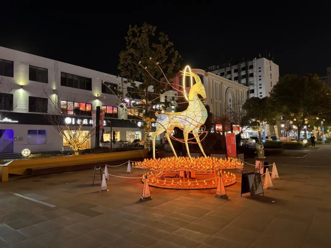 走进长阳创谷,九色鹿主题的灯光装置散发着柔和光芒,园区内的行道树被灯串层层缠绕,暖黄色的灯光星星点点,与九色鹿的光彩相互映衬,为夜晚的长阳创谷增添了几分温馨。