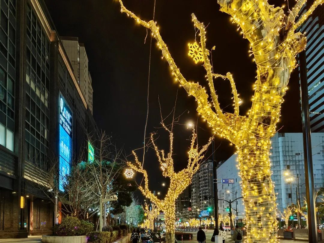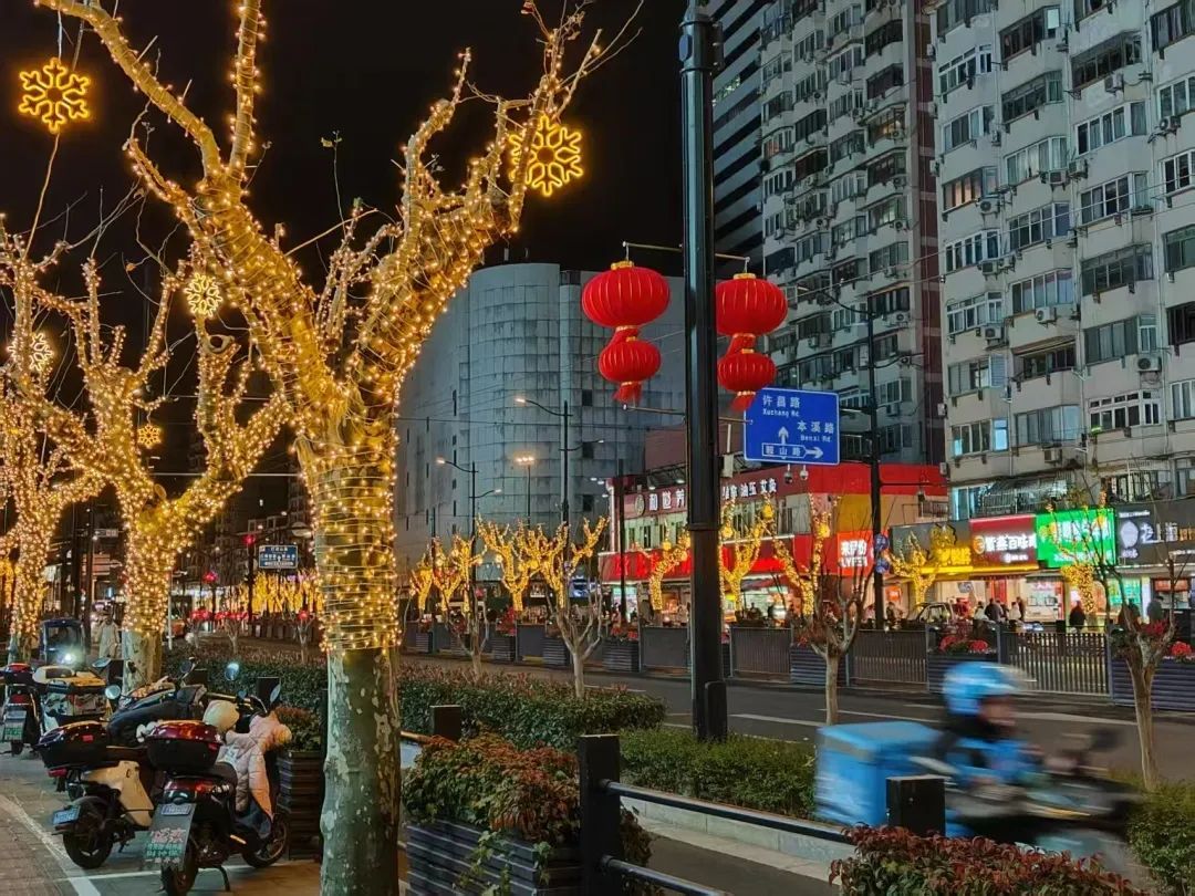漫步杨浦街头,入目皆是喜庆,江浦路、控江路等主干道焕然一新,道路两旁的树干与树冠,以金色灯串和金色雪花装饰,微风拂过,挂件轻轻晃动,仿佛在向过往行人诉说新春的祝福,绵延的灯光与装饰让整个街区都沉浸在祥和的年味之中。