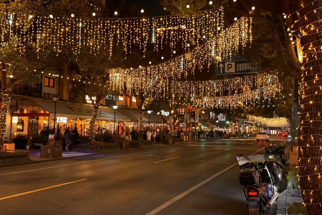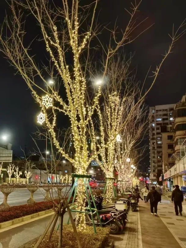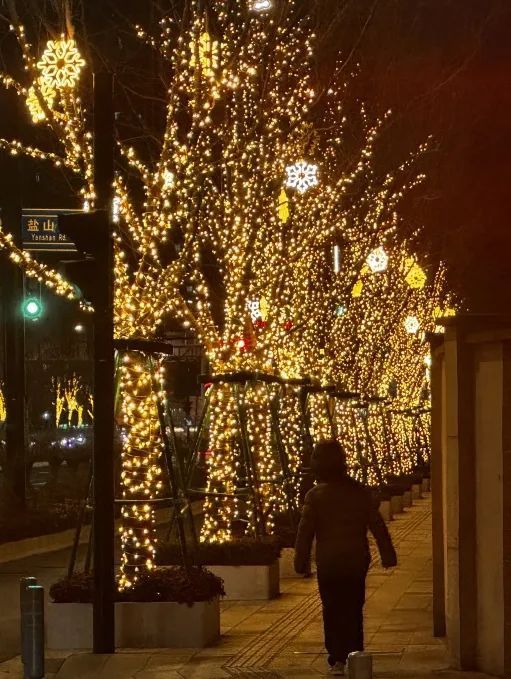 大学路展现出独特的文艺浪漫,路边的树木被一串串暖黄色的灯带缠绕,宛如繁星闪烁,抬头望去,树与树之间,瀑布灯从高处倾泻而下,为新年谱写了一曲光与影的浪漫乐章。