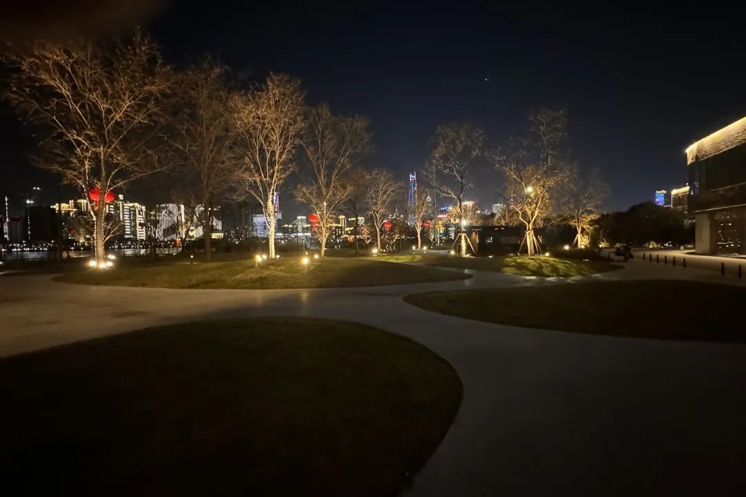 杨浦滨江也换上了新春的“盛装”,红灯笼挂满枝头,银色的灯带给树木披上了一件华丽的礼服,地上的投影,随着行人的脚步变换,带来满满的互动乐趣。