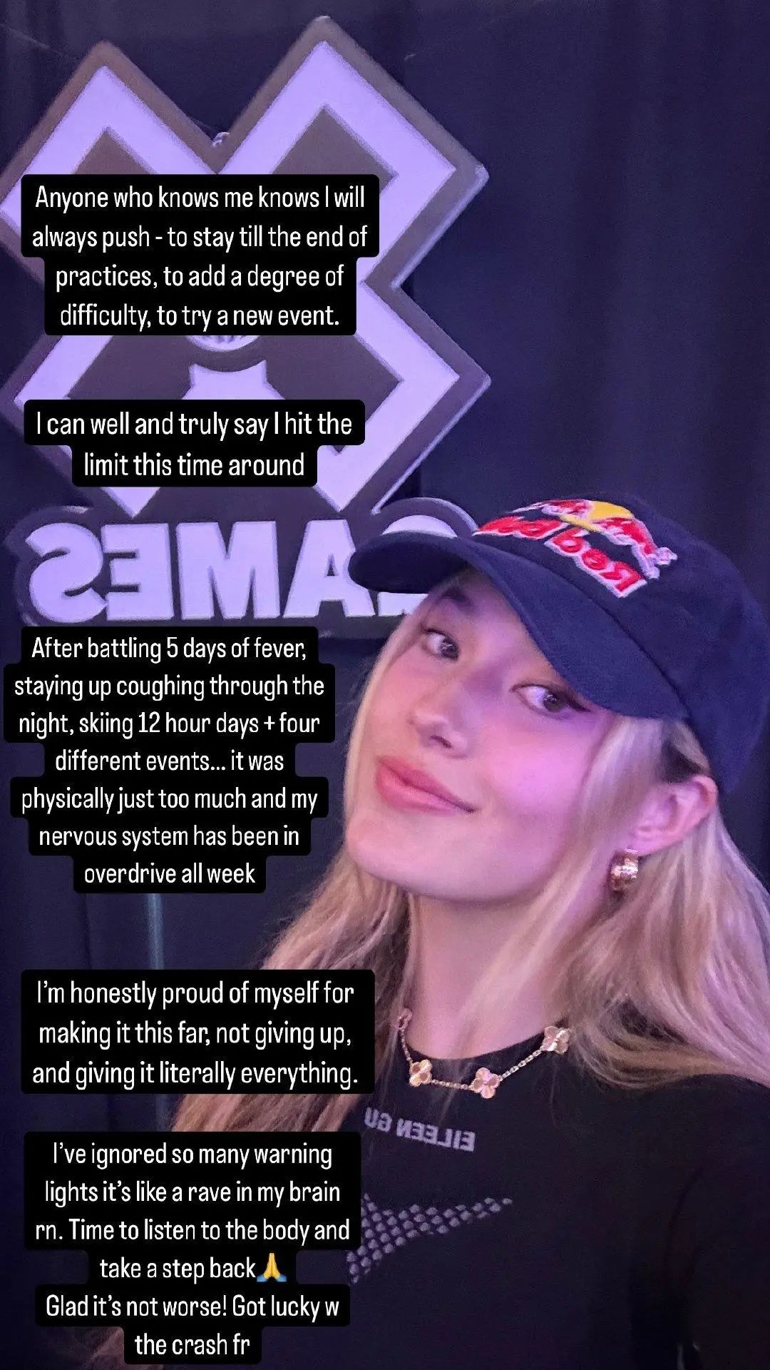 在与发烧缠斗了五天,整夜咳嗽无法入睡,每天滑雪12个小时备战四个不同的项目之后,谷爱凌称自己的身体上实在是吃不消了,“我的神经系统一整周都处于超负荷状态。老实说,我为自己能坚持到现在、没有放弃并且倾尽全力而感到骄傲。我忽视了太多危险信号,现在我的大脑就像在狂欢一样。是时候倾听身体的声音,退一步了。很开心这次摔倒不是特别严重,真的挺幸运。”