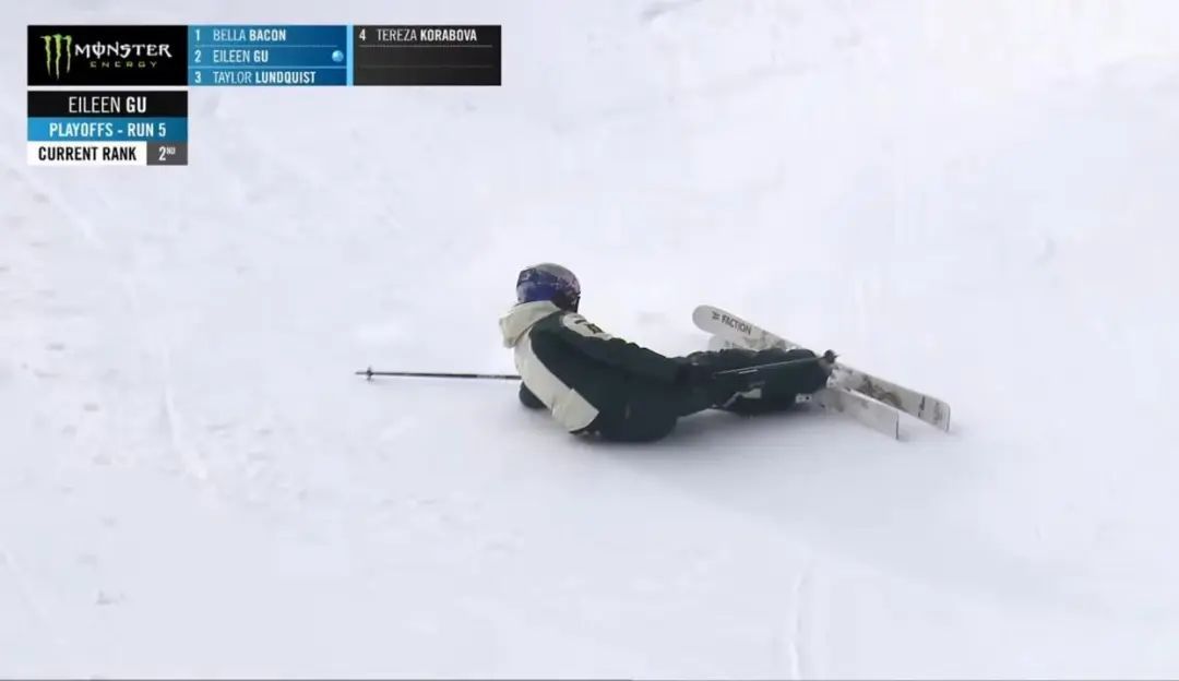 女子双板街区赛决赛共四人参加,谷爱凌第三位出场,但在比赛过程中接连摔倒三次,最终位列第四名。