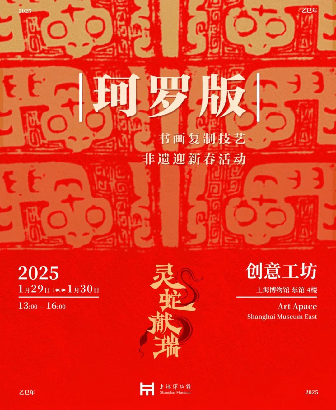 为了庆祝春节成为世界级的非物质文化遗产,我们结合“灵影仙踪:上海博物馆蛇年迎春展”,从中提取了展品“西周昭王 员方鼎”的蛇形纹样,在2025年1月29日(初一)和30日(初二)的13:00-16:00,举办蛇年专属珂罗版非遗体验文创活动,和各位观众一起祈福安康,度过别有滋味的蛇年新春。