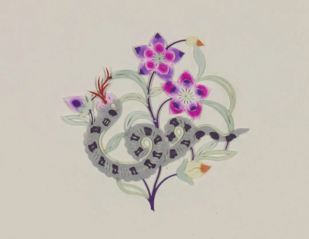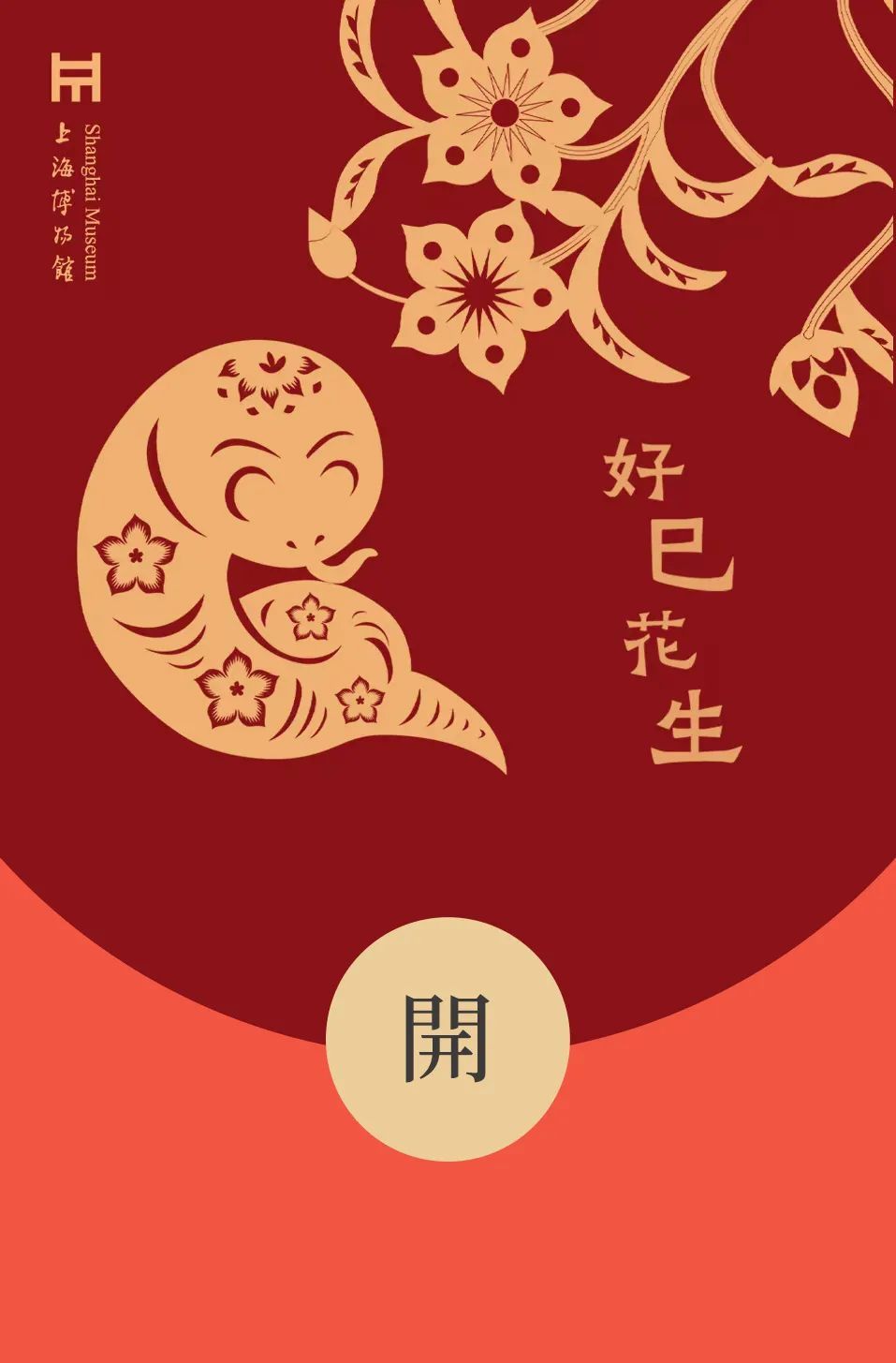 “好巳花生”,寓意“好事发生”。红包封面的设计灵感,来自上博馆藏的生肖蛇刻纸。蛇身蜿蜒,花丛生机盎然,传播春回大地的讯息。