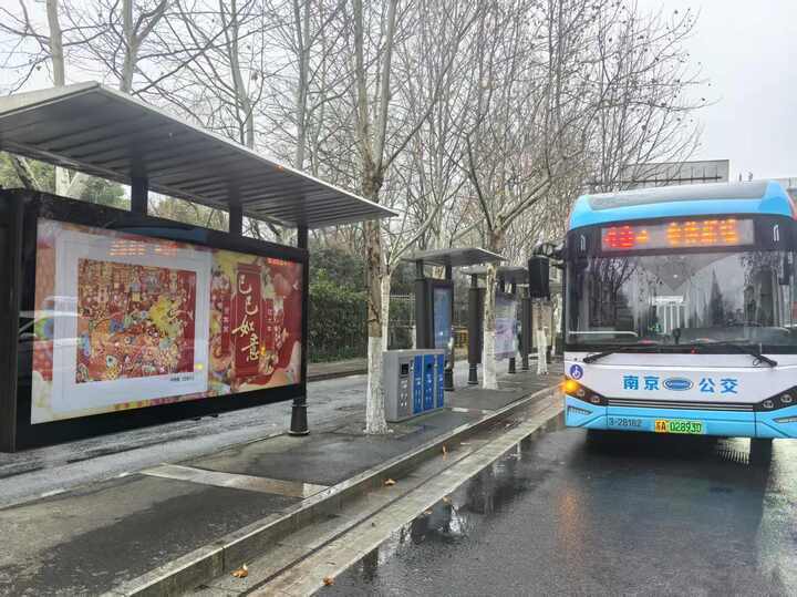 武定门公交站台则换上了《非遗文化代代传》的年画作品。“很喜庆,从画面中可以感受人们幸福美好的生活,很有春节氛围”,来南京旅游的大学生小王同学正忙着拍照打卡。
