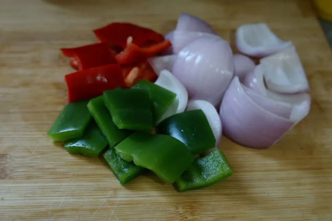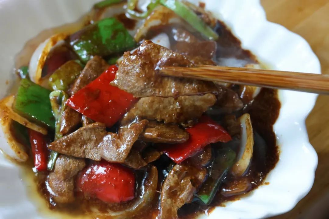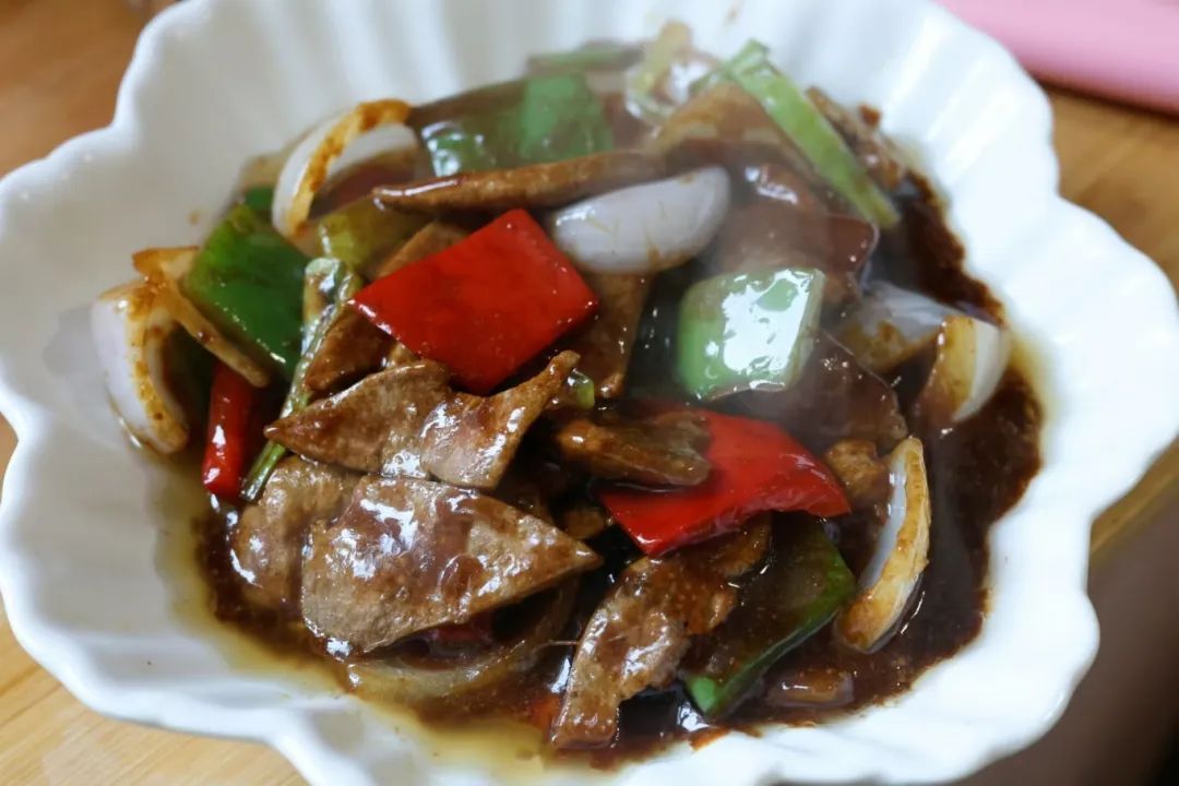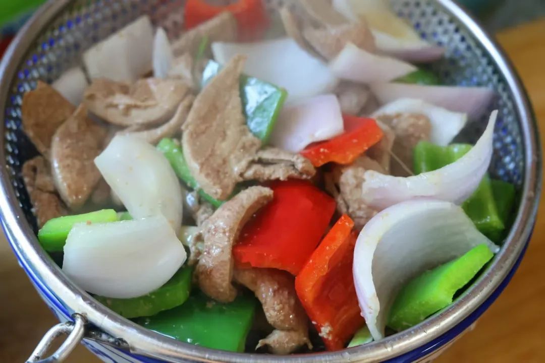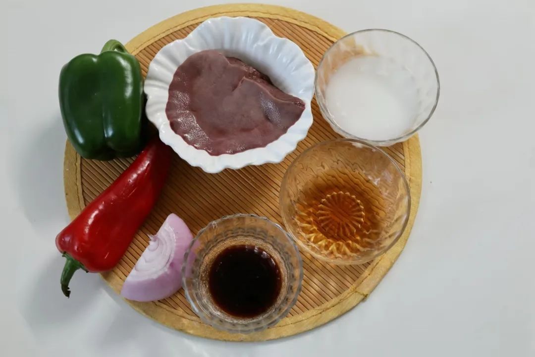 食材:猪肝300克、洋葱半个、灯笼青椒1个、红甜椒1个、料酒20克、蚝油25克、玉米淀粉15克、食用油45克、盐适量、糖适量、味精适量