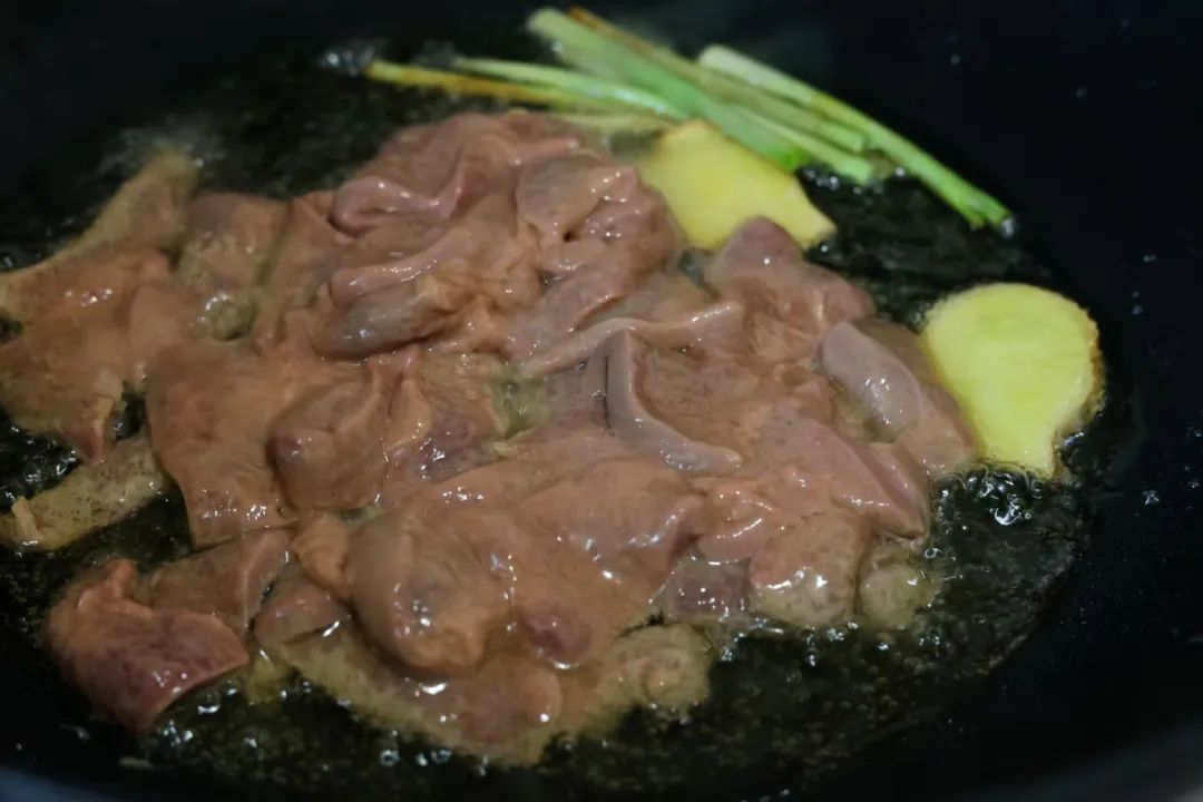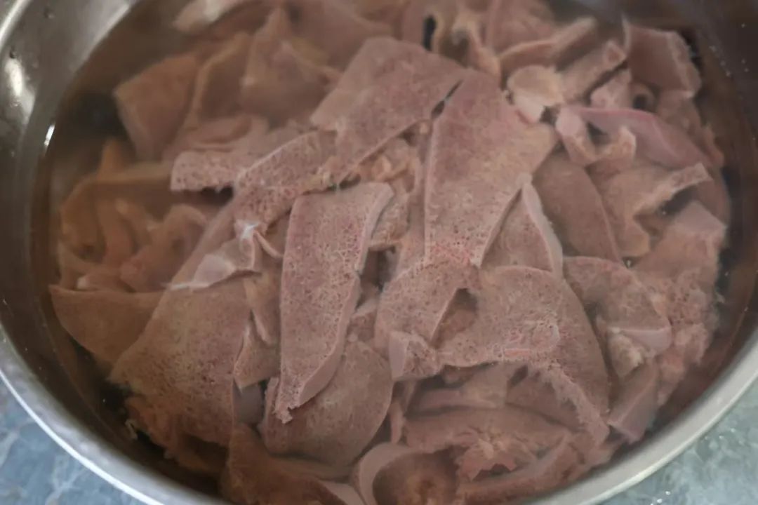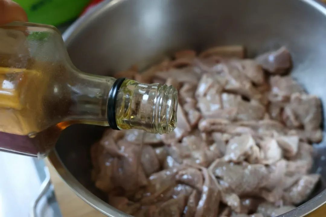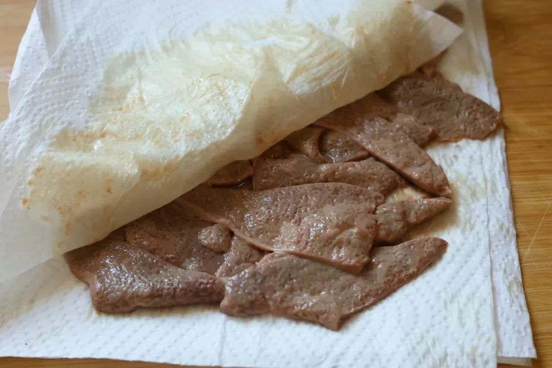 1.猪肝切薄片,过4遍清水,用厨房纸擦干水分。