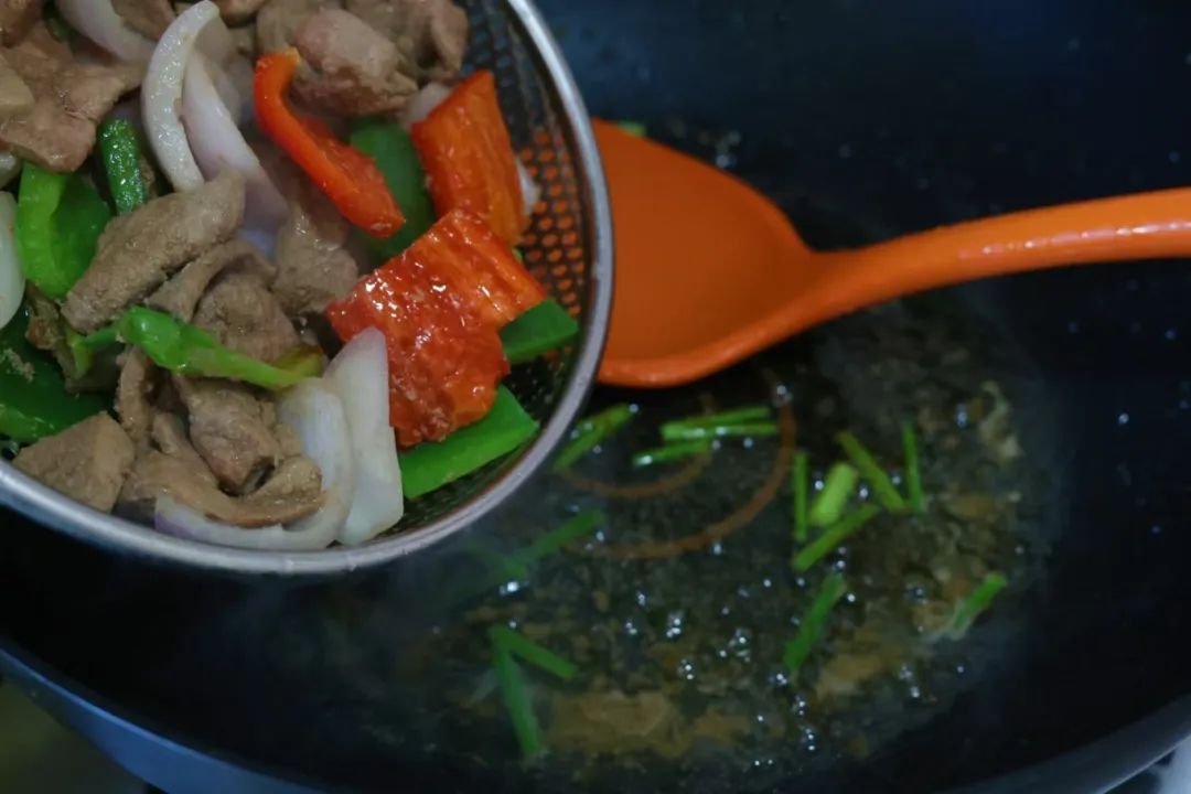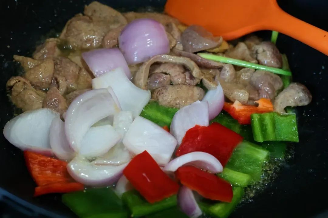 3.青红椒、洋葱切小块,葱、姜油中爆香,倒入猪肝翻炒。