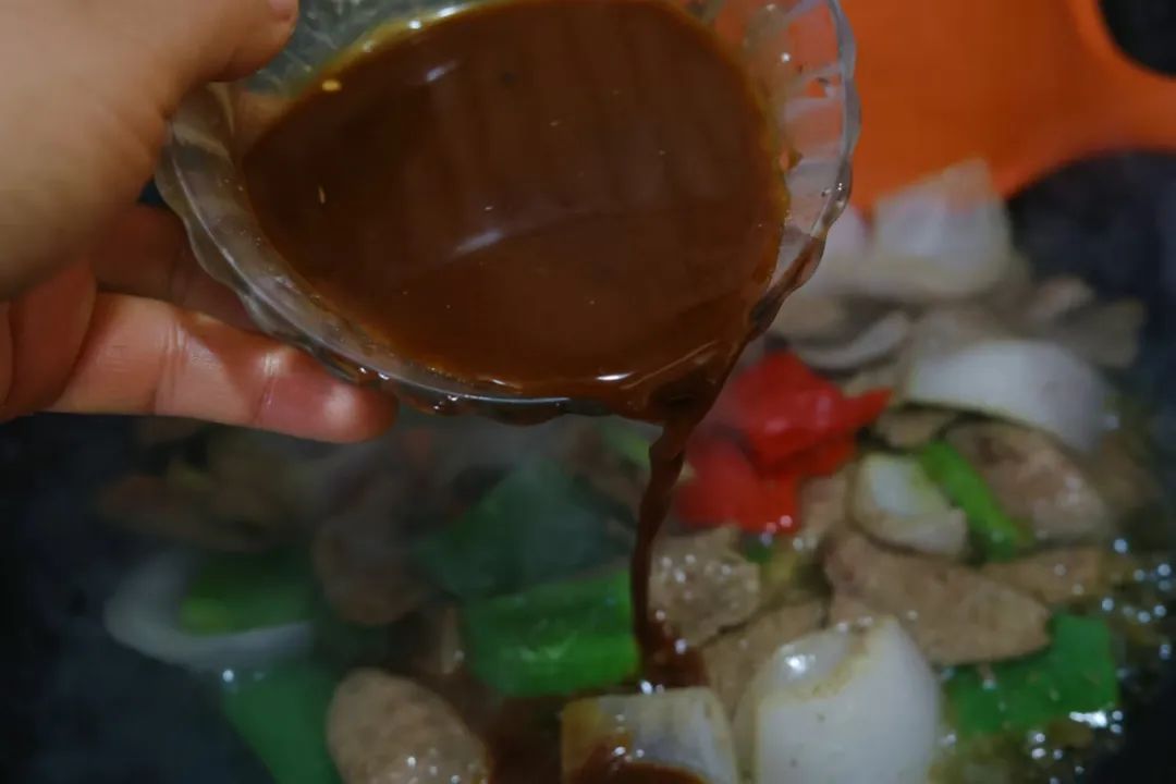 6.在原锅中再次倒入少量食用油,翻炒后倒入酱汁。