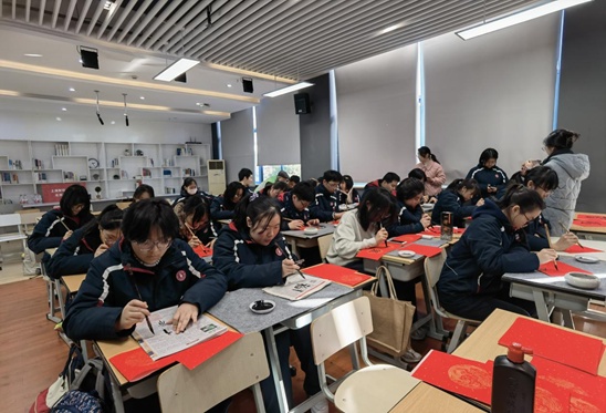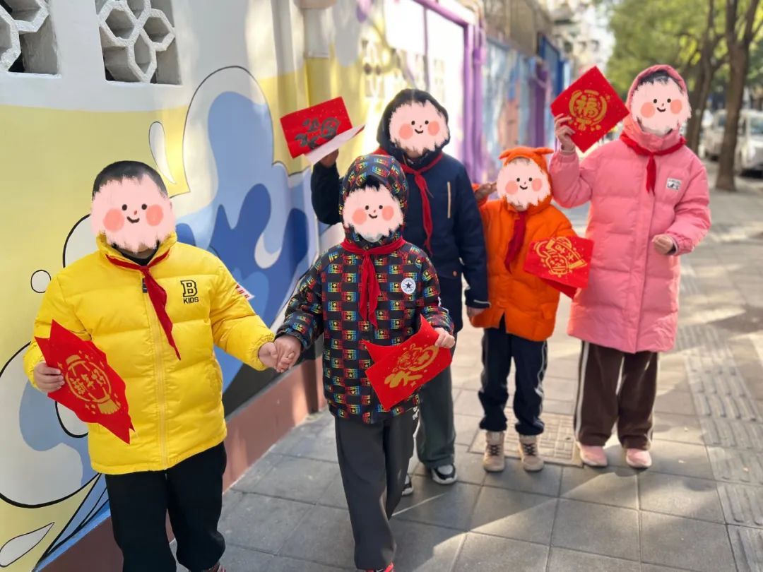 学生们挥毫泼墨,认真书写着一个个寓意吉祥的“福”字和春联,一个个“福”字、一副副春联饱含着对新年的美好期许。随后,学生们带着这些满载祝福的“福”字和春联,和老师及街区书记一起走街串巷,亲手将祝福送到了沿街商户们的手中。