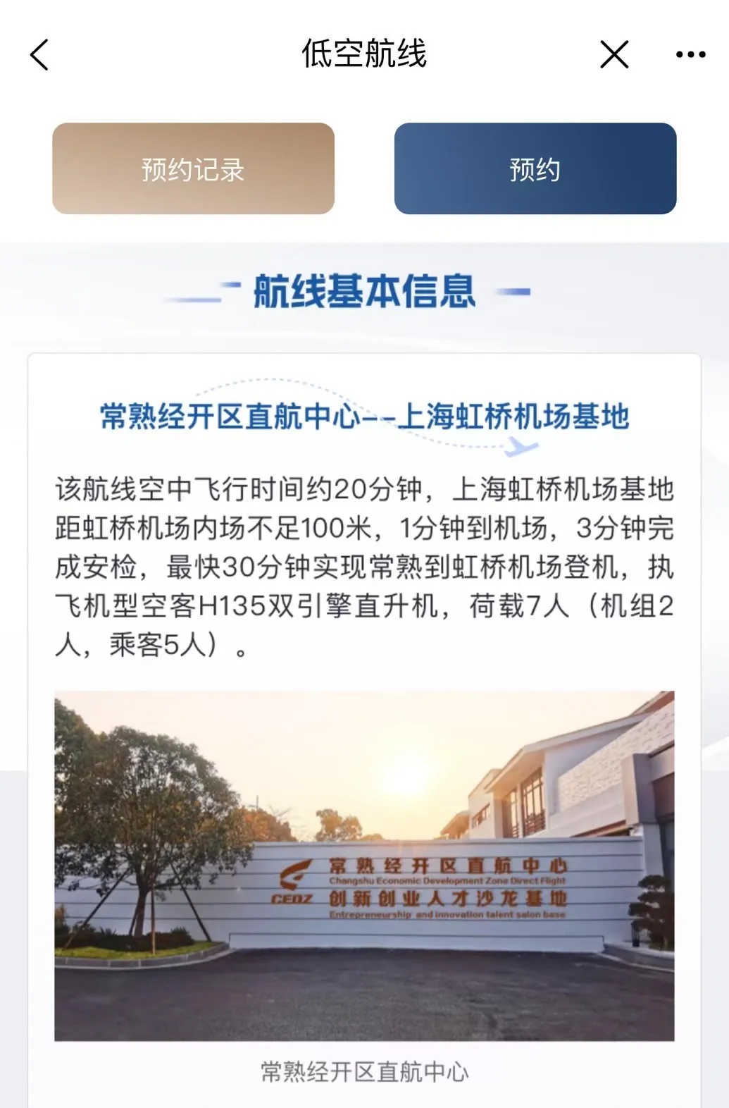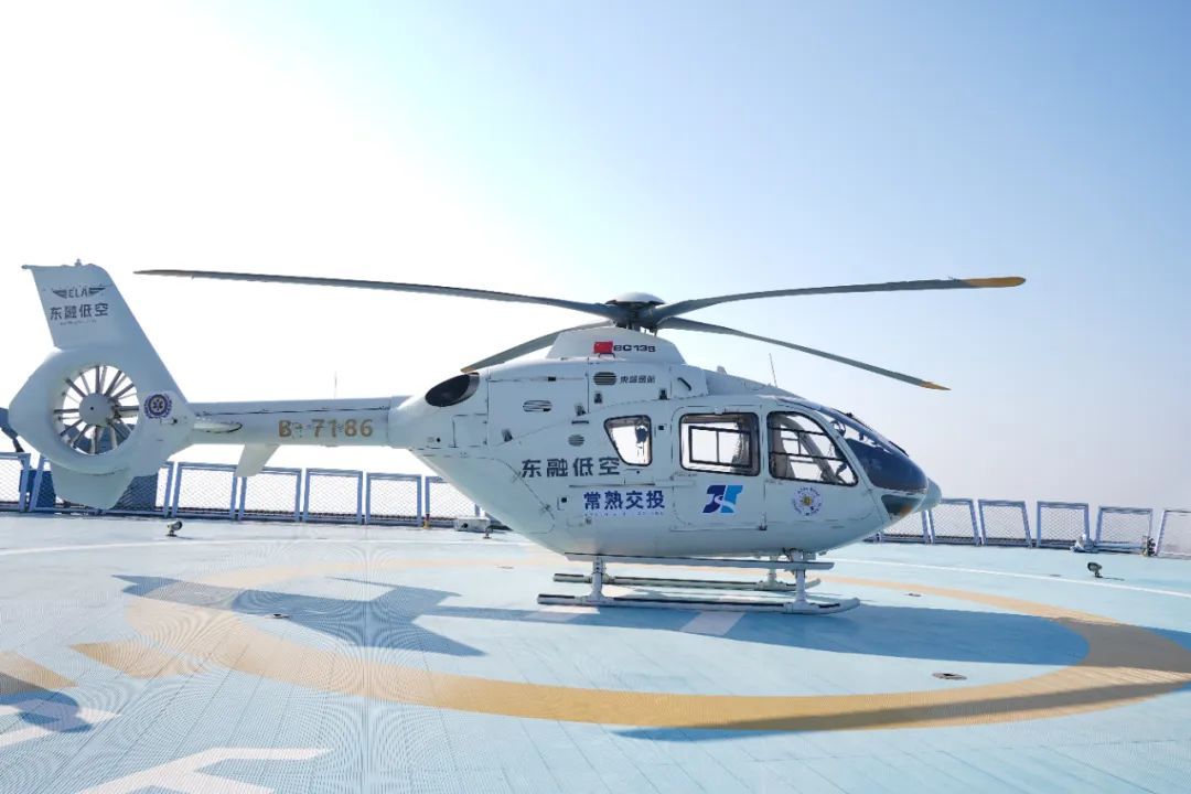 该航线空中飞行时间约20分钟,由东部通航执飞,采用空客H135双引擎直升机,核载7人(机组2人,乘客5人),安全性能稳定,空间宽阔,乘坐舒适。落地的上海虹桥机场基地距虹桥机场内场不足100米,落地后旅客1分钟到机场,3分钟完成安检,最快30分钟实现常熟到虹桥机场登机。