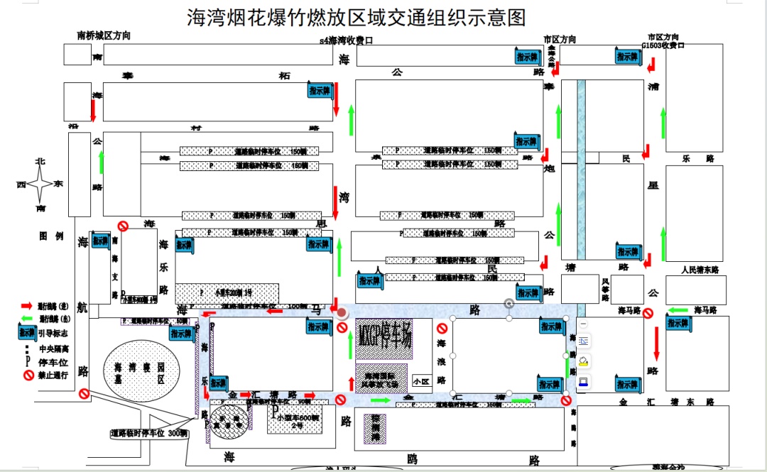交警部门已在浦星/海马、浦星/人民塘等15处路口设置交通诱导指示牌(进场、返回),在各停车场出口设置右转提示牌,在海湾/金汇塘等8处设置禁止标志牌,请务必留意。