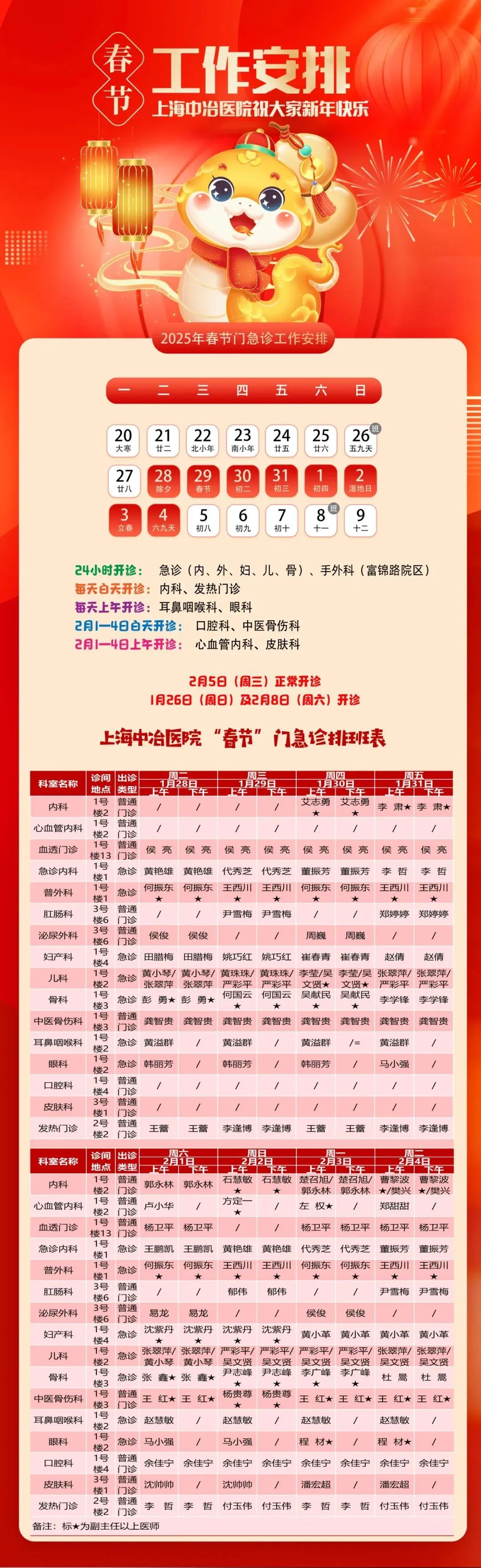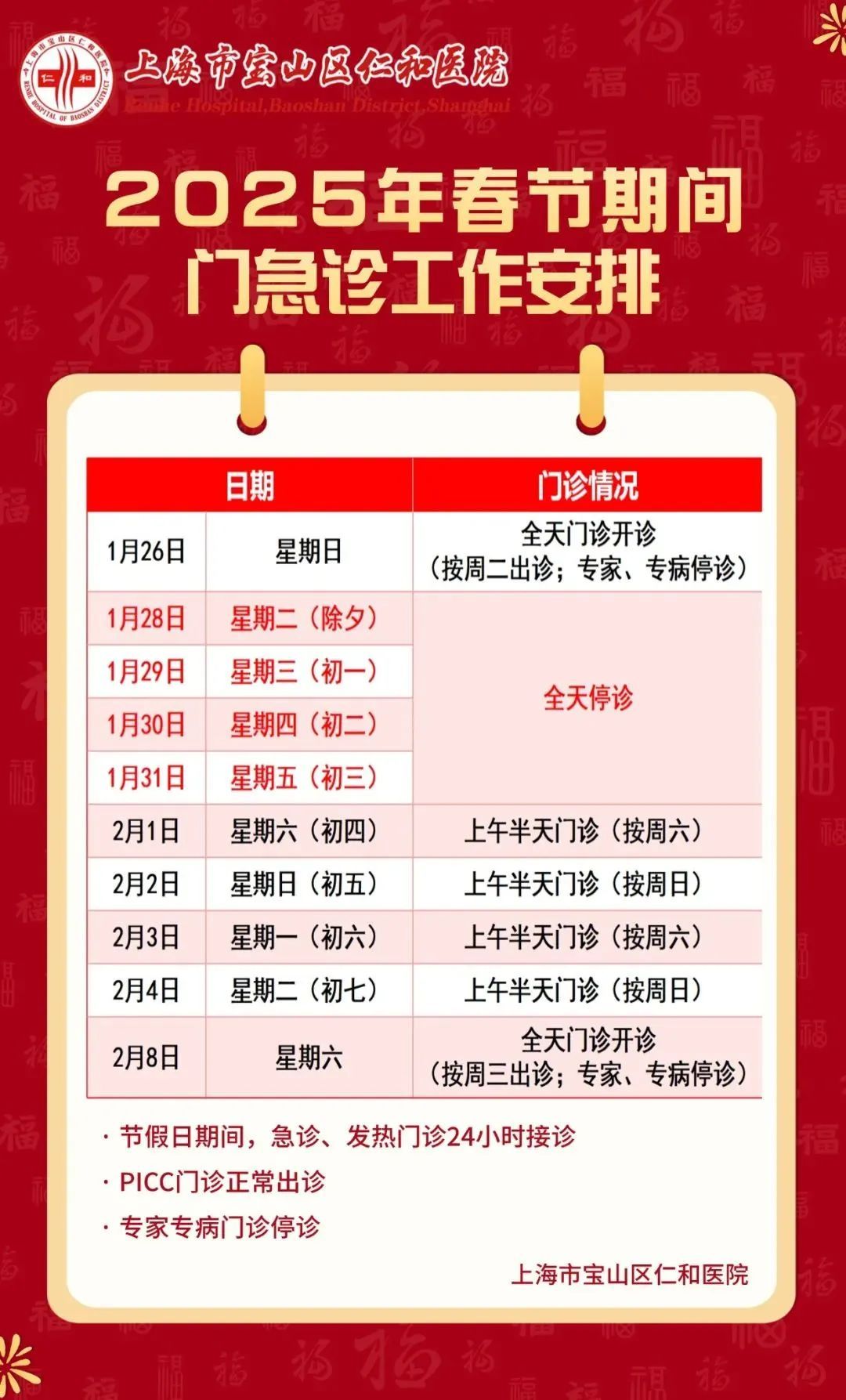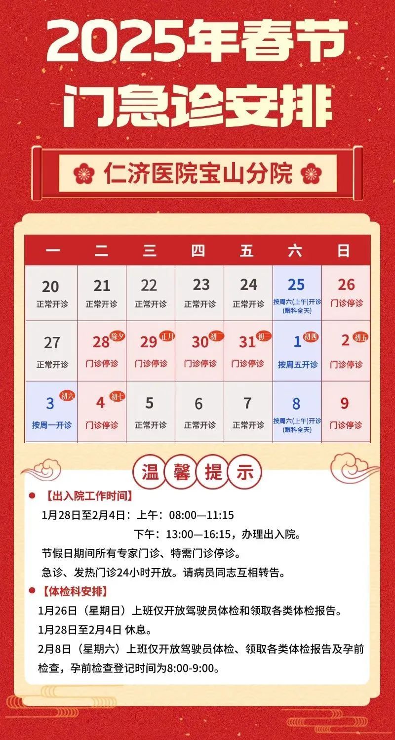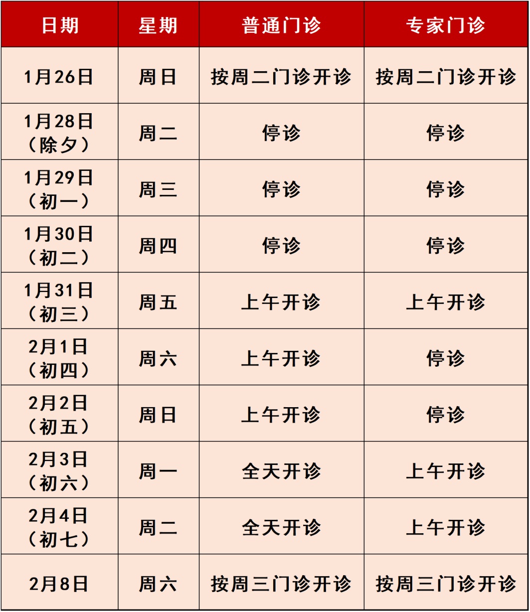 春节长假期间的门、急诊时间安排