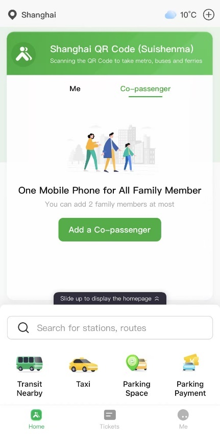 “随申行”APP(SH MaaS)通过“随申码”(Shanghai QR Code)提供地铁、公交、轮渡等“一码通行”服务。如有多人同行,“随申码”支持添加至多2名同行人,一部手机可依次为本人及同行乘客刷码乘车。