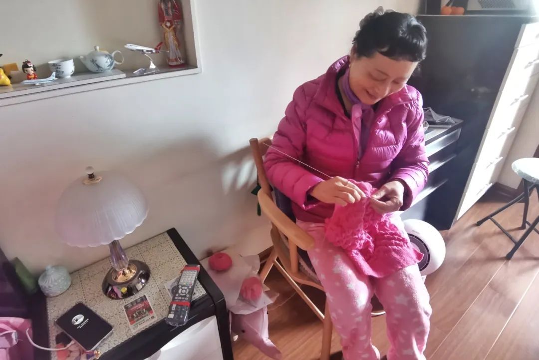 今年63岁的董莉是玉屏居民区的老居民,她是一个兴趣爱好十分广泛的人,除了弹琴、跳舞外,她从年轻时就非常喜欢编织,退休后也有了更多时间研究毛线的款式和花样,小到杯垫、围巾、帽子,大到毛衣、毯子,都难不倒她。闲暇时,客厅一隅的小沙发就成了董莉的专属编织位,她坐在其中,手里的棒针翻飞、指尖的毛线来回穿梭,享受着沉浸在编织中的美好时光。