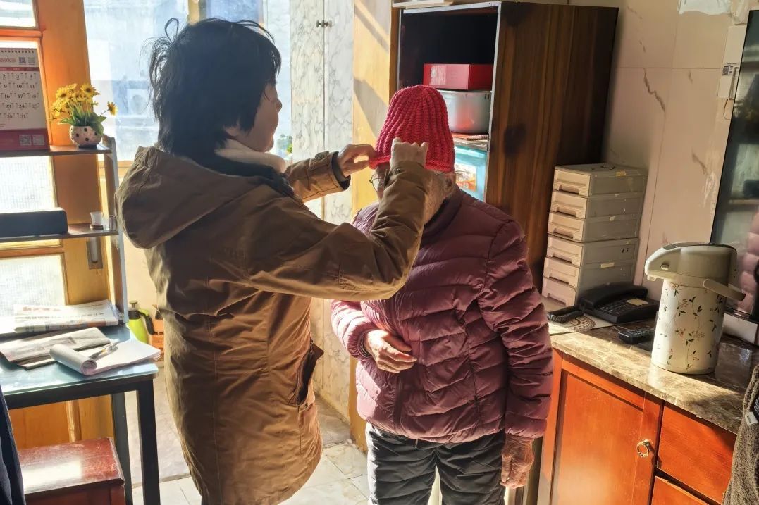 岁寒之际,玉屏居民区的不少高龄老人收到了居委会送去的帽子和围巾,他们外出散步、采购年货都会戴着,看起来格外温暖和喜庆,而这些款式各异的帽子和围巾其实都出自社区居民董莉的巧手。