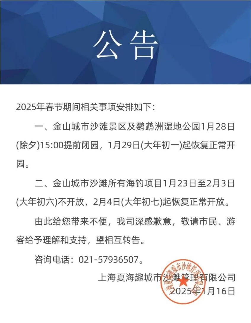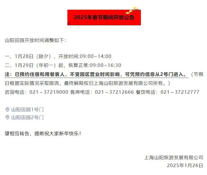 金山部分景点、场馆春节开放时间→