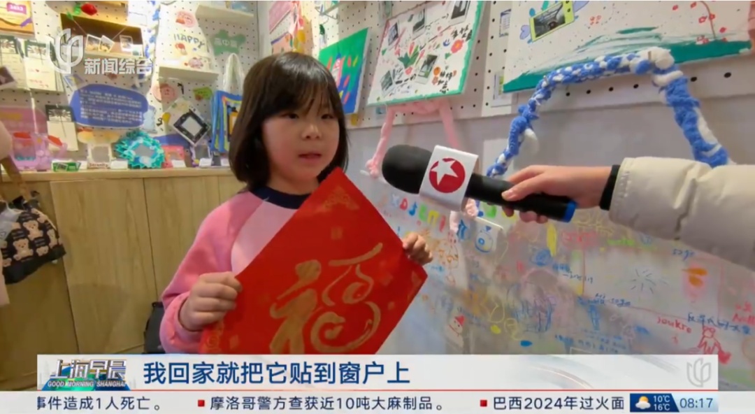 1月23日,新闻综合频道“上海早晨”栏目报道:申城街头洋溢着浓浓的新春氛围,愚园路上的一个艺术展门口,聚集了不少市民。梧桐树下,孩子们穿上传统服饰,非遗代表性传承人手把手带他们一起拓印福字,创意无限、年味满满。几十名延安初级中学的孩子将亲手写的福字、春联送进愚园路沿线的商铺,一起拍一张全家福,让福气在新一年延续。