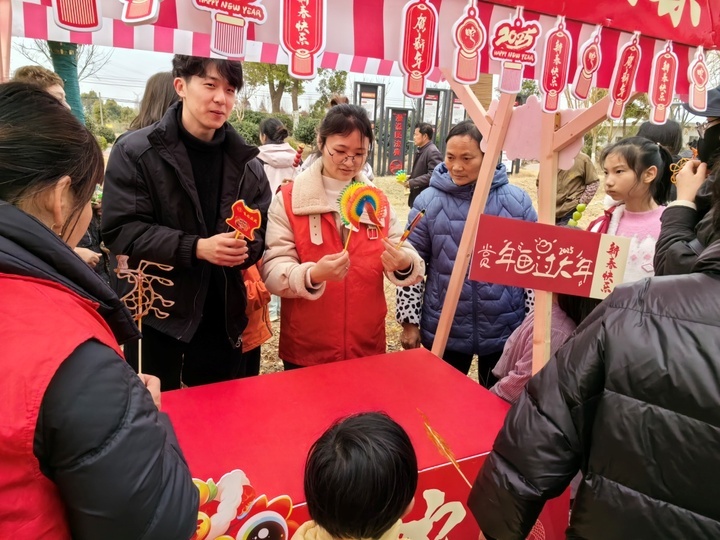 新春游园环节设置了年货大集、非遗展示、老物件竞猜、拔河游戏等功能板块,并邀请了书法名家现场为群众写福送福。张灯结彩的小游园,成为年轻群众和少年儿童欢乐的海洋。糖画、剪纸、草编、捏面人、纸翻花等非遗作品吸引了众多年轻人,糖葫芦、板栗等传统美食很快被“抢购一空”。村民周佳高兴地说,家门口的“村晚”活动,能够让大家就近赏民俗、购年货、品美食,尽情享受节日的休闲快乐时光,确实很开心。她认为,这就是年轻一代想象中的“年味”。