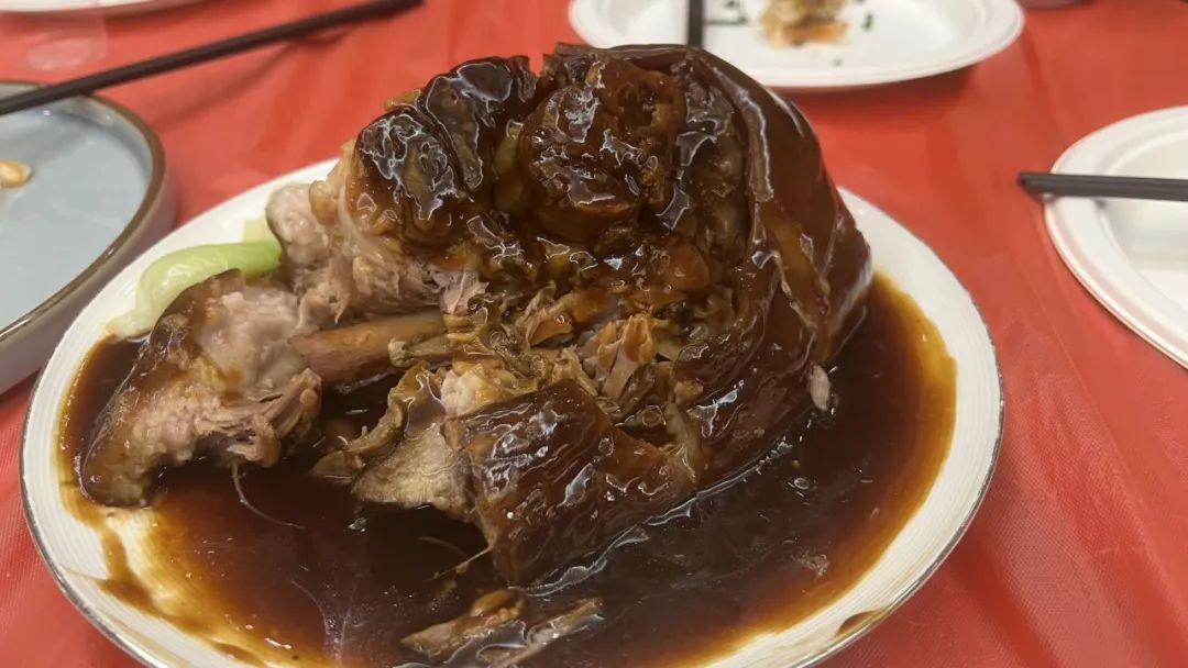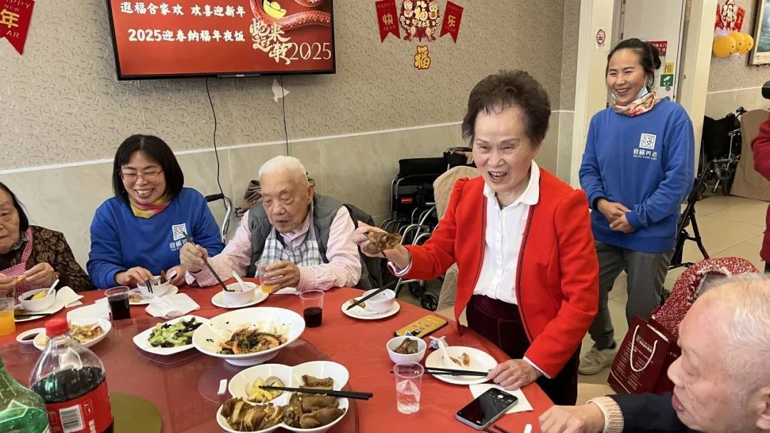 年夜饭在欢声笑语中展开,桌上摆满了丰盛的美味佳肴,浓汁大乌参、红烧蹄髈,响油鳝丝、八宝鸭、松鼠鳜鱼、腌笃鲜等,都是上海常见的年菜,大厨们特地将其做得酥烂入味,既有本帮味道,又对老人的肠胃“友好”。一顿年夜饭大家吃得热气腾腾,护理员们不时帮着夹菜送汤,老人们喜笑颜开。老家在舟山的高老伯告诉记者,今天的年夜饭餐桌上,养老院准备了丰盛佳肴,很合他的口味,十分开心。大家来自四面八方,共赴“家宴”,必要的仪式感也不能少。吴阿婆换上了大红的外套,喜气洋洋。“和伙伴们一起吃年夜饭,特地穿了红色的外套,红红火火迎接新年。”在这个特殊的日子里,养老院贴心地准备了视频连线送祝福环节,让远在他乡的子女也能和父母视频碰面,互道祝福。上海遐福养老院院长蔡琦告诉记者,每年的这顿年夜饭,是必不可少的,既是春节前的仪式感,更是养老院给大家的祝福。文字/图片:陈涛