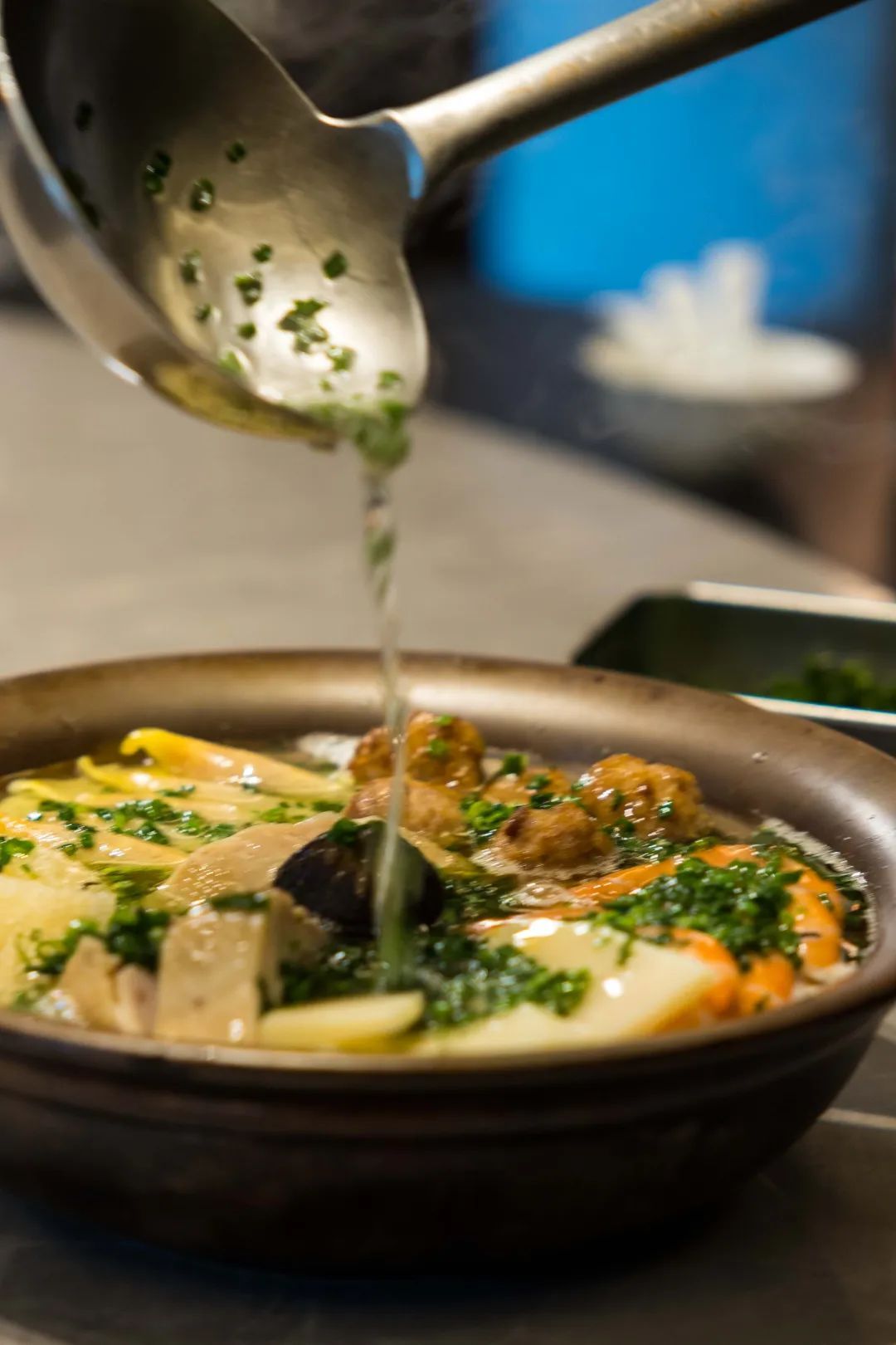 4.另起锅烧油,油温七成热时撒入葱花,一同浇入汤锅,提香的同时增加菜品的光泽度。