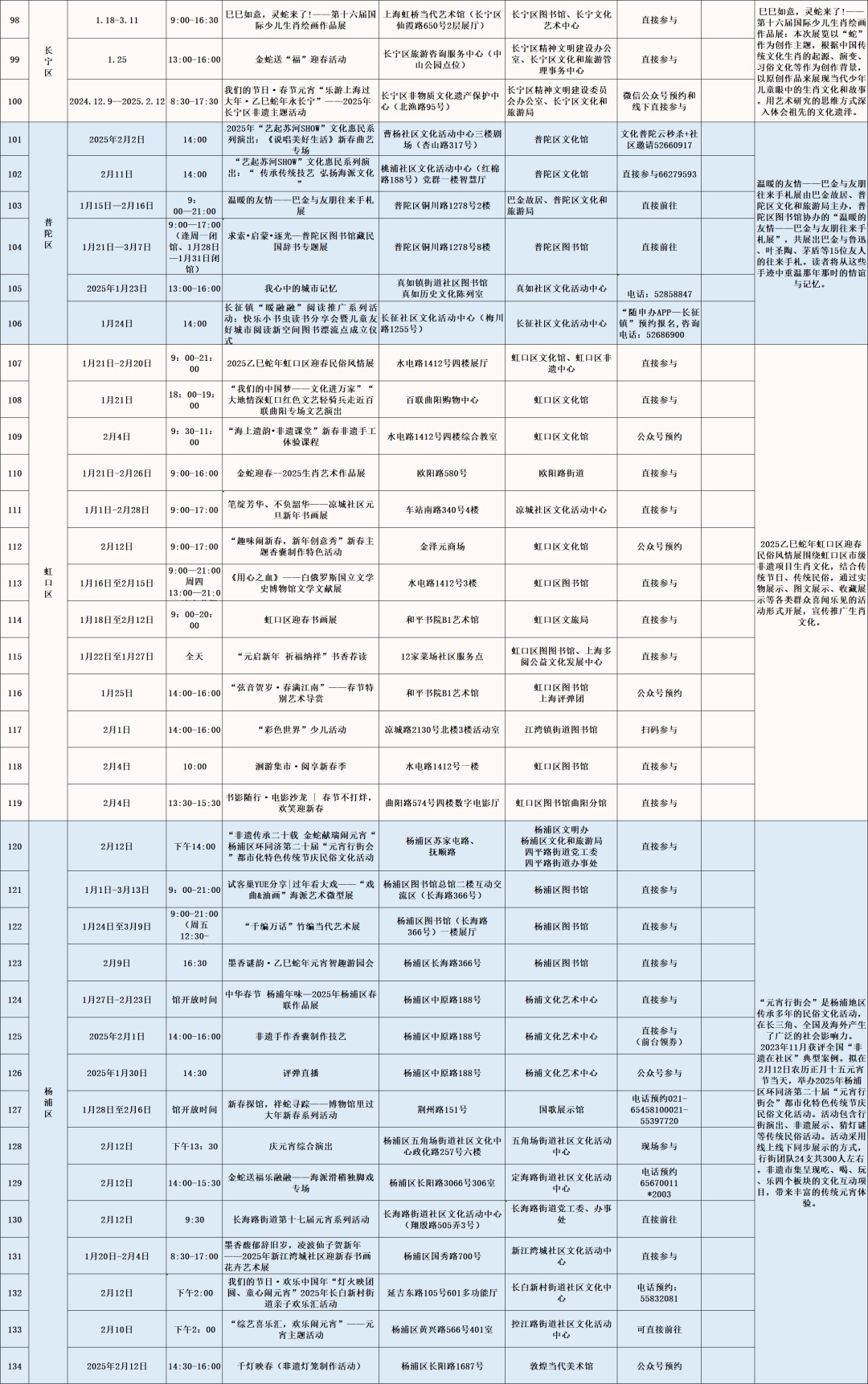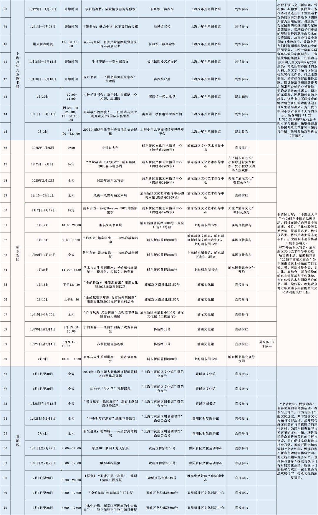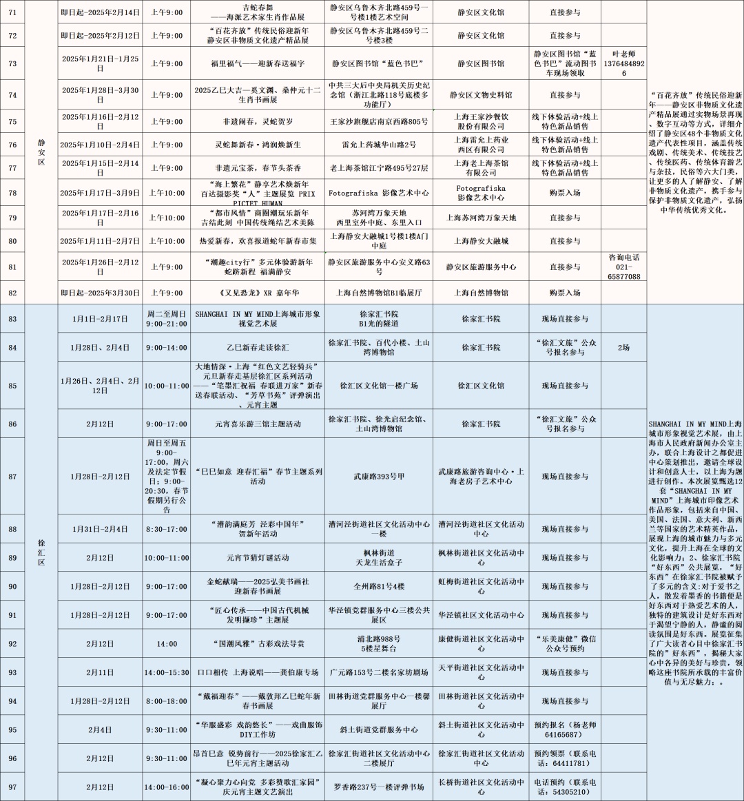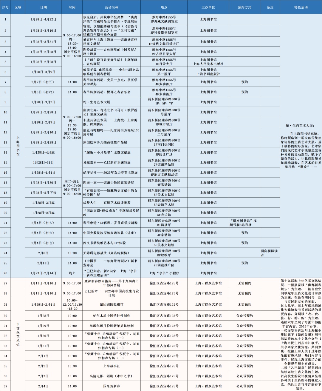 以艺术展览、演出以及各门类艺术文博讲座、导赏、培训、体验、互动等为主的公共文化活动。如上海图书馆东馆“蛇·生肖艺术大展”、上海市群众艺术馆“魔都新春娱乐指南——第十七届海上年俗风情展”、上海自然博物馆《又见恐龙》XR 嘉年华、长宁区“巳巳如意,灵蛇来了!”第十六届国际少儿生肖绘画作品展、徐汇区“SHANGHAI IN MY MIND”上海城市形象视觉艺术展、闵行区“贞观鉴—大唐历史文化主题展”精品文物展览、普陀区“温暖的友情——巴金与友朋往来手札展”、崇明区《诗路长歌——第三届长三角中国画名家邀请展》等。