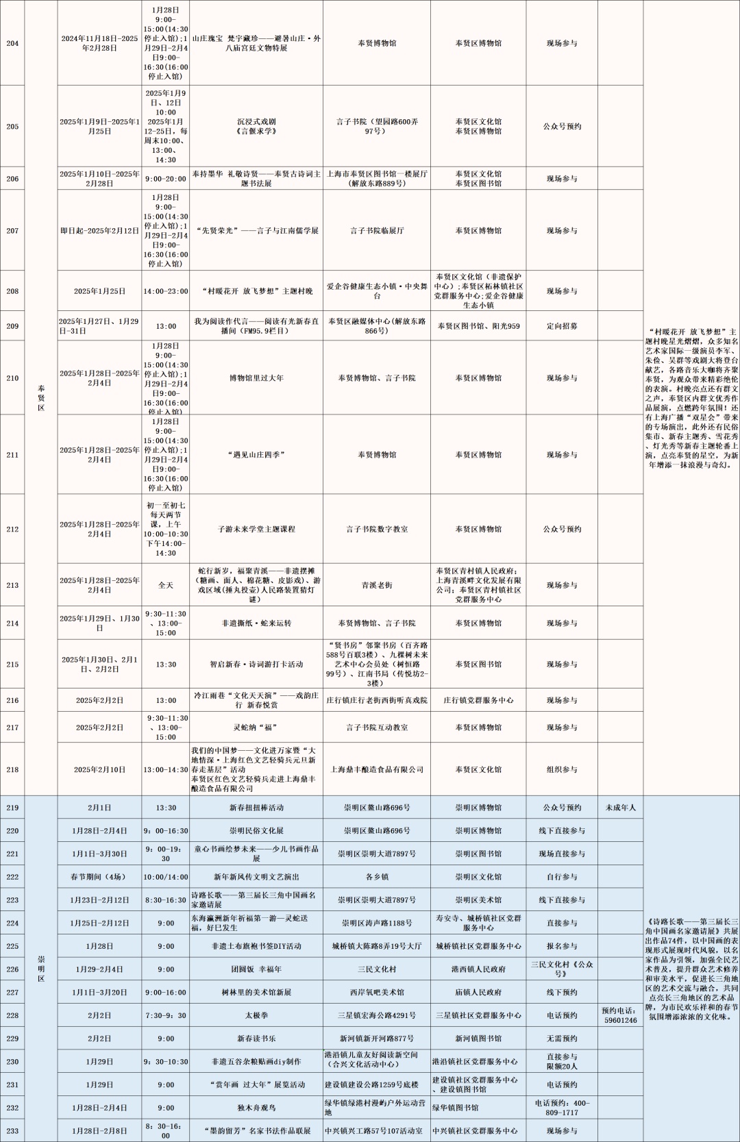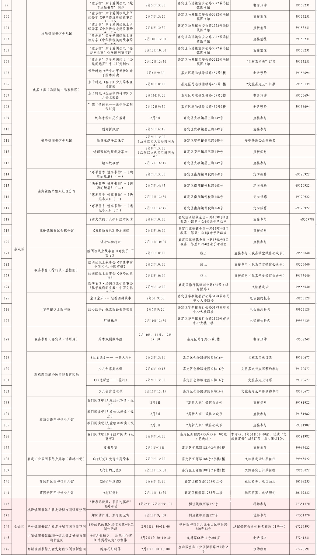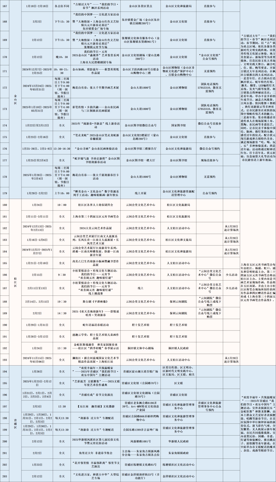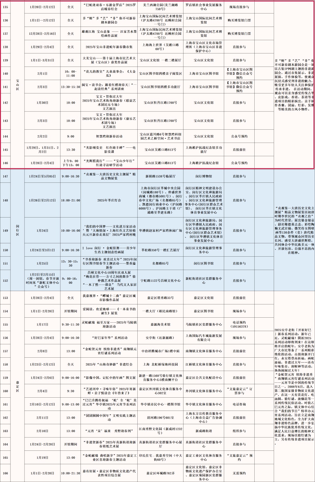 以艺术展览、演出以及各门类艺术文博讲座、导赏、培训、体验、互动等为主的公共文化活动。如上海图书馆东馆“蛇·生肖艺术大展”、上海市群众艺术馆“魔都新春娱乐指南——第十七届海上年俗风情展”、上海自然博物馆《又见恐龙》XR 嘉年华、长宁区“巳巳如意,灵蛇来了!”第十六届国际少儿生肖绘画作品展、徐汇区“SHANGHAI IN MY MIND”上海城市形象视觉艺术展、闵行区“贞观鉴—大唐历史文化主题展”精品文物展览、普陀区“温暖的友情——巴金与友朋往来手札展”、崇明区《诗路长歌——第三届长三角中国画名家邀请展》等。