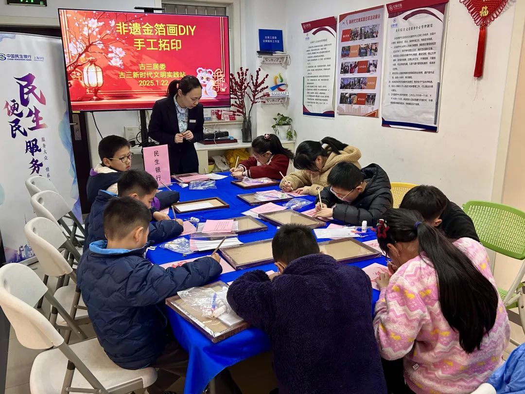 随着农历新年的脚步日益临近,徐汇区虹梅街道古三居民区洋溢着浓浓的节日氛围。为了迎接蛇年的到来,社区青少年们拿起画笔和金箔纸,沉浸式体验非遗金箔画DIY手工拓印活动,为新春佳节增添了独特的文化韵味和金红光彩。