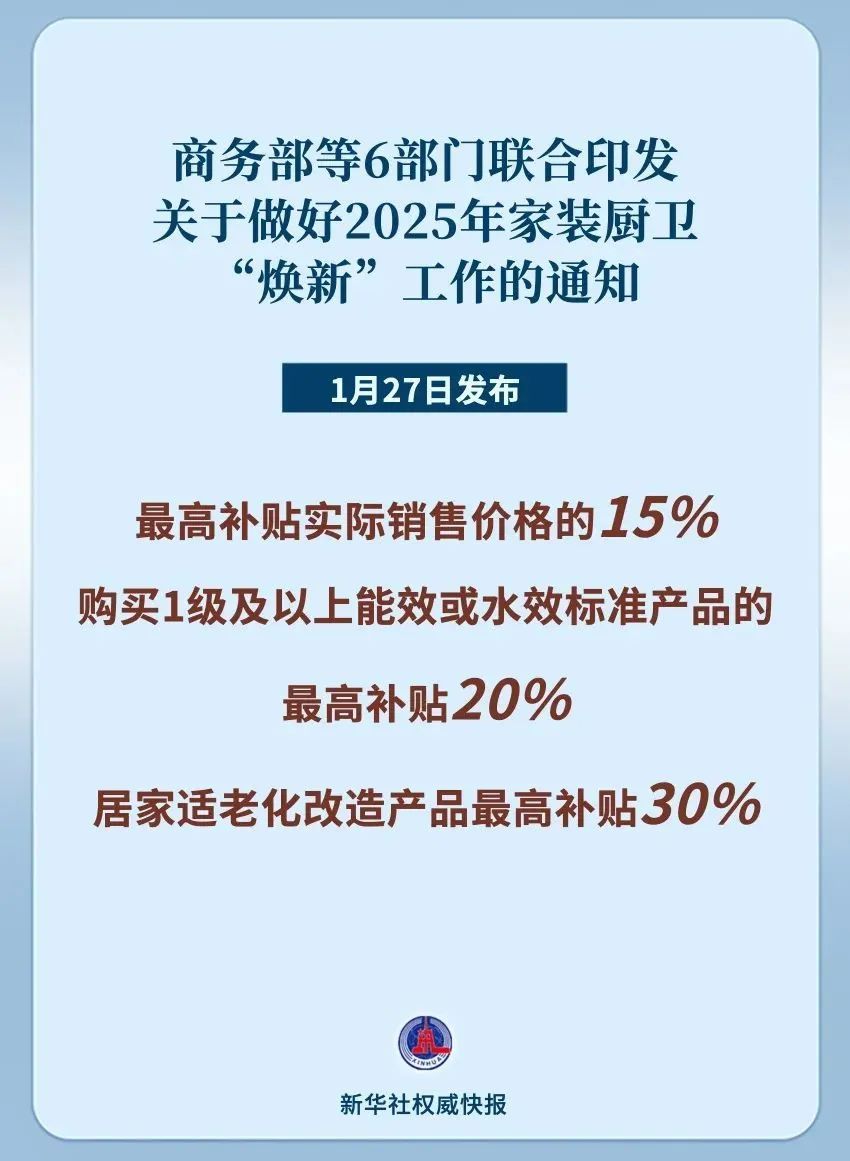 商务部等6部门近日印发关于做好2025年家装厨卫“焕新”工作的通知1月27日发布