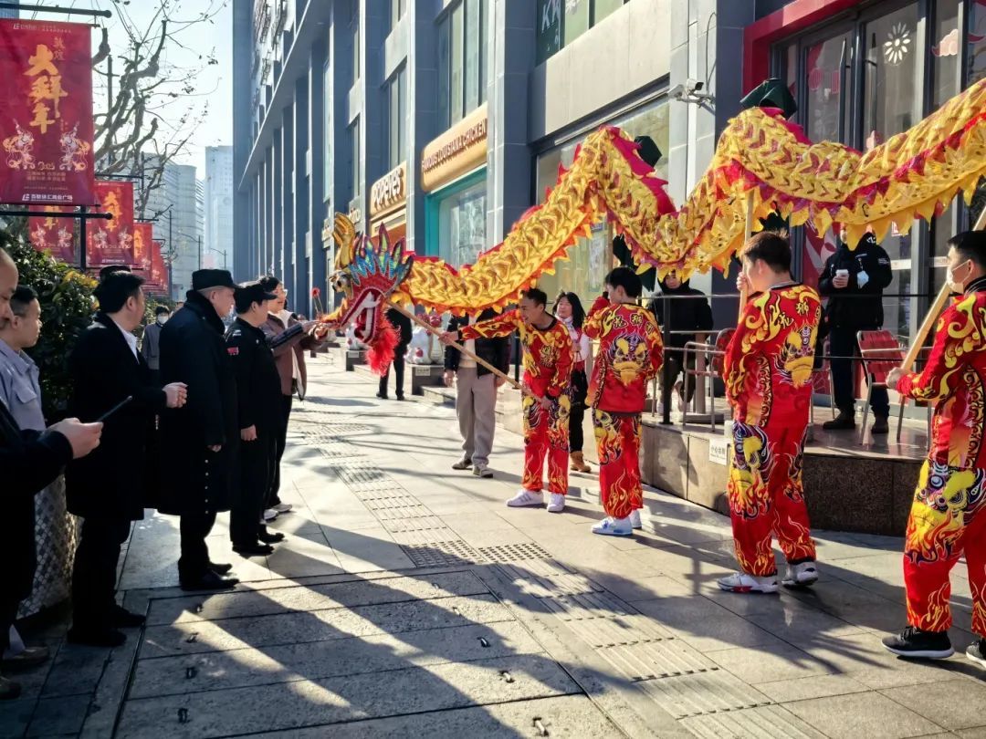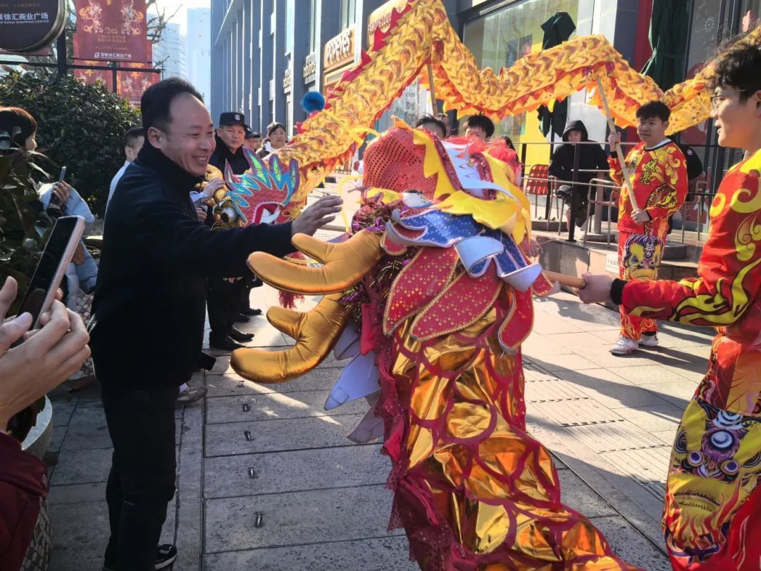 活动现场,舞龙队伍身着绚丽服饰,手中长龙灵动飞舞。伴随着激昂的锣鼓声,巨龙时而盘旋、时而翻腾,动作行云流水,栩栩如生,引得现场顾客纷纷驻足观看,人群中不时爆发出阵阵掌声和欢呼声。“这舞龙太精彩了,看着就特别喜庆,新年的氛围一下子就有了!”市民李女士兴奋地说,“带着孩子来感受传统年味,真是一次很棒的体验。”舞动的长龙不仅带来了视觉上的震撼,更传递着祥瑞与活力,为新的一年注入无限生机。