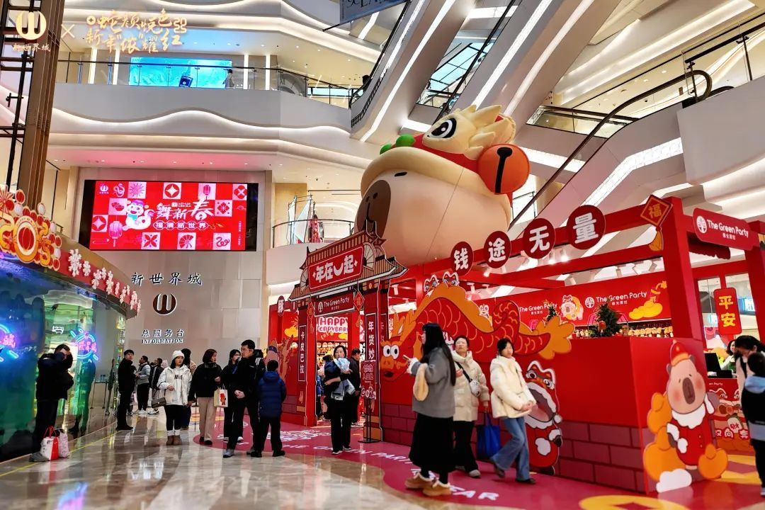 1月24日至2月15日,新世界城1F北中庭卡皮巴拉快闪店喜气亮相,活动期间,水豚巡游见面会,水豚与顾客亲密互动。店内毛绒玩具、盲盒等周边商品更是让人爱不释手。