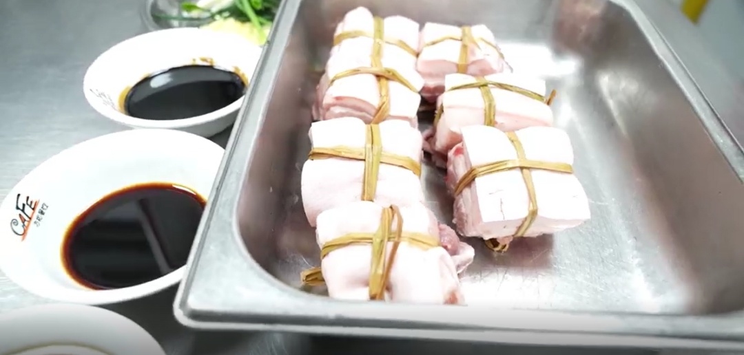 稻草扎肉是年夜饭餐桌上的主角,香而不腻、干而不柴是这道菜的关键所在。闵华表示,稻草扎肉需要选择带骨的五花肉来烹饪,在制作的过程中,要注意火候的掌握。其次,选择优质的稻草,将五花肉打一个“十”字扎紧,焯水去腥。