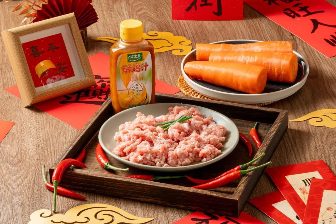 肉馅500克、胡萝卜3根、鲜鸡汁、葱姜蒜适量