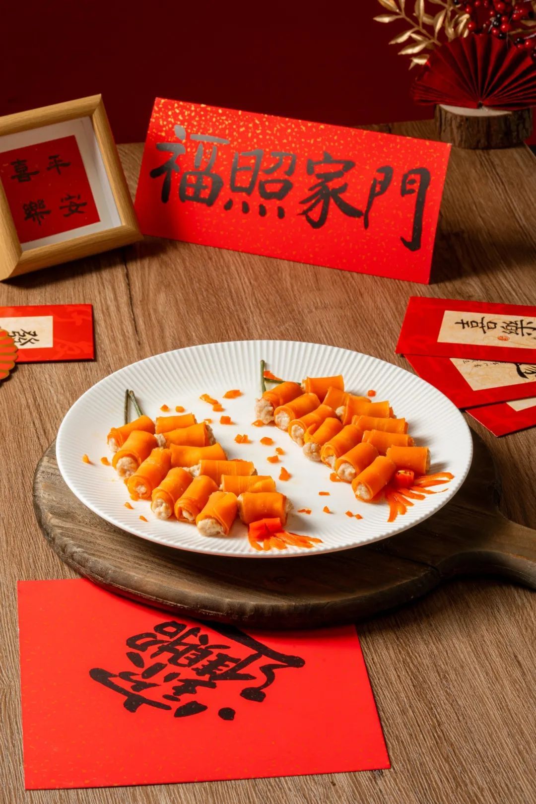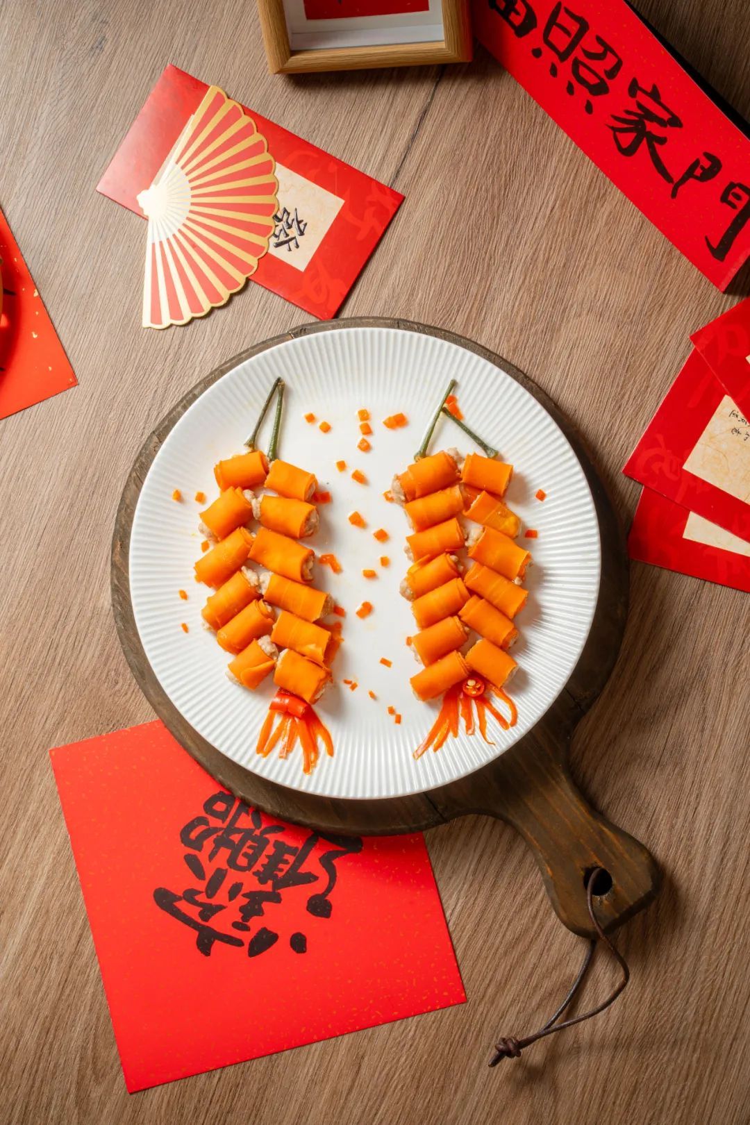 4.将萝卜片卷起,加入适量肉馅,用萝卜丝做点缀,上锅蒸8分钟即可出锅摆盘。
