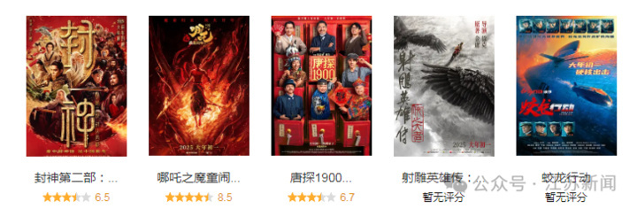 截至目前,春节档6部电影已有三部在豆瓣开分,其中《封神第二部:战火西岐》开分6.5分,《唐探1900》开分6.7分,《哪吒之魔童闹海》开分8.5分,《熊出没·重启未来》《蛟龙行动》《射雕英雄传:侠之大者》暂未开分。