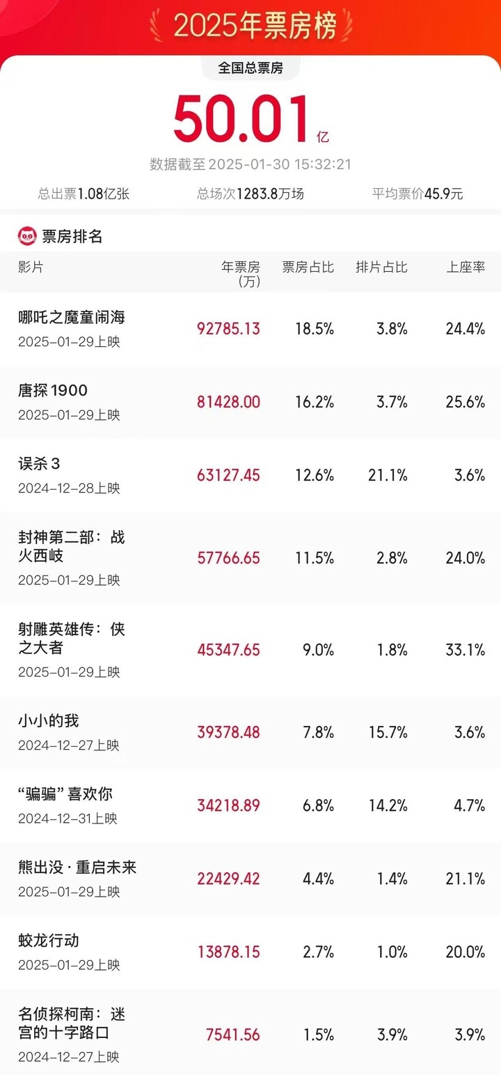 《哪吒之魔童闹海》《唐探1900》《封神第二部:战火西岐》分列春节档票房榜前三位。
