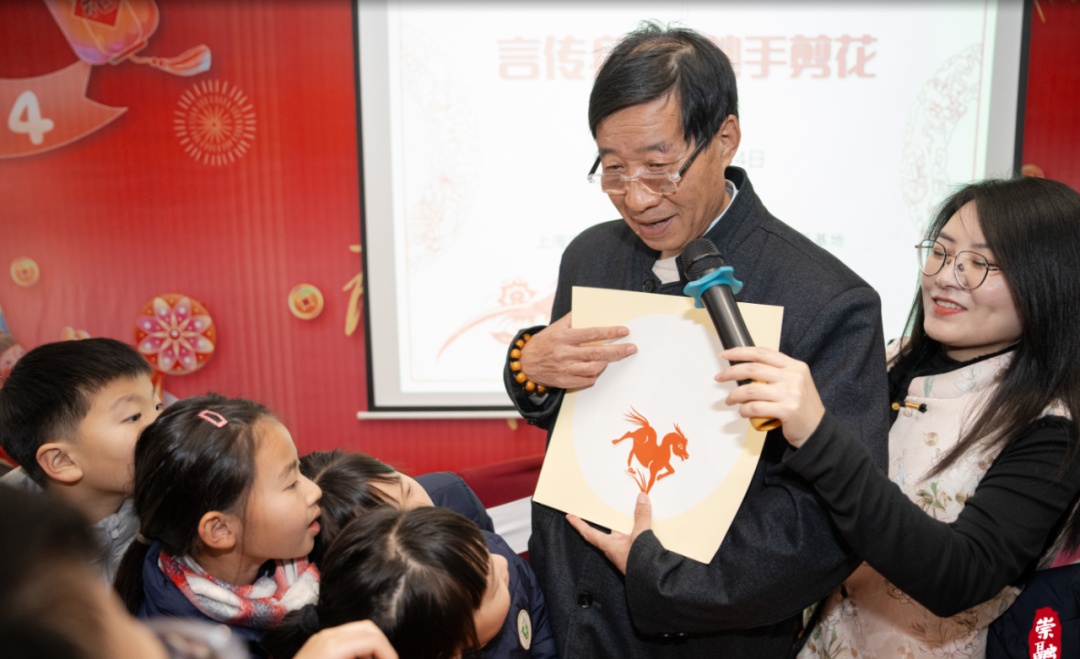 记者采访当天,恰巧碰上一群小学生在三民文化村游学,郑树林看见孩子们特别高兴,一下子就和他们打成一片,孩子们也顺理成章多了一堂临时体验课——剪纸。一把剪刀,一张红纸,边剪边解说,行云流水,一气呵成,孩子们好奇地围在郑树林身边,看得出神,听得入迷。不一会,一匹栩栩如生的奔腾小马跃然纸上,引得孩子们发出连连赞叹。