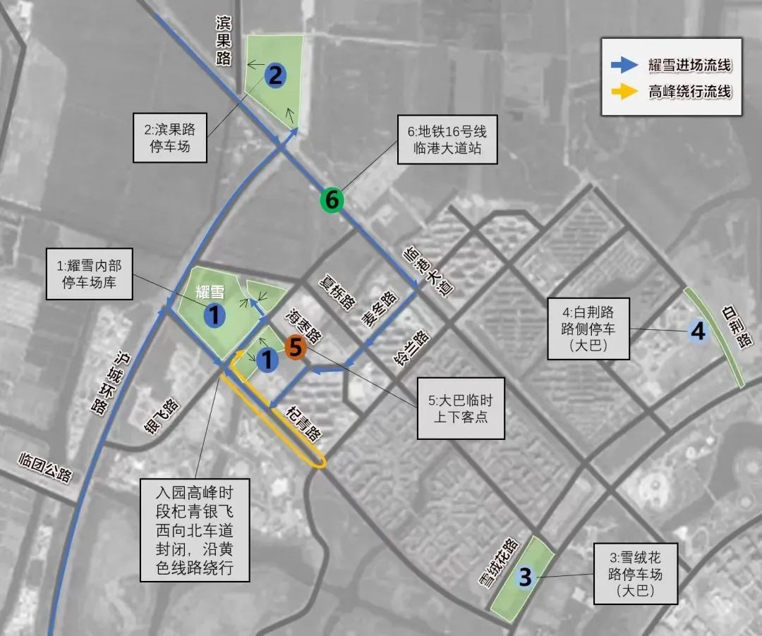 1、入园高峰时段,杞青路/银飞路交叉口将采取交通管制,西向北左转车道封闭,入园车辆须经杞青路/铃兰路交叉口调头驶入银飞路。